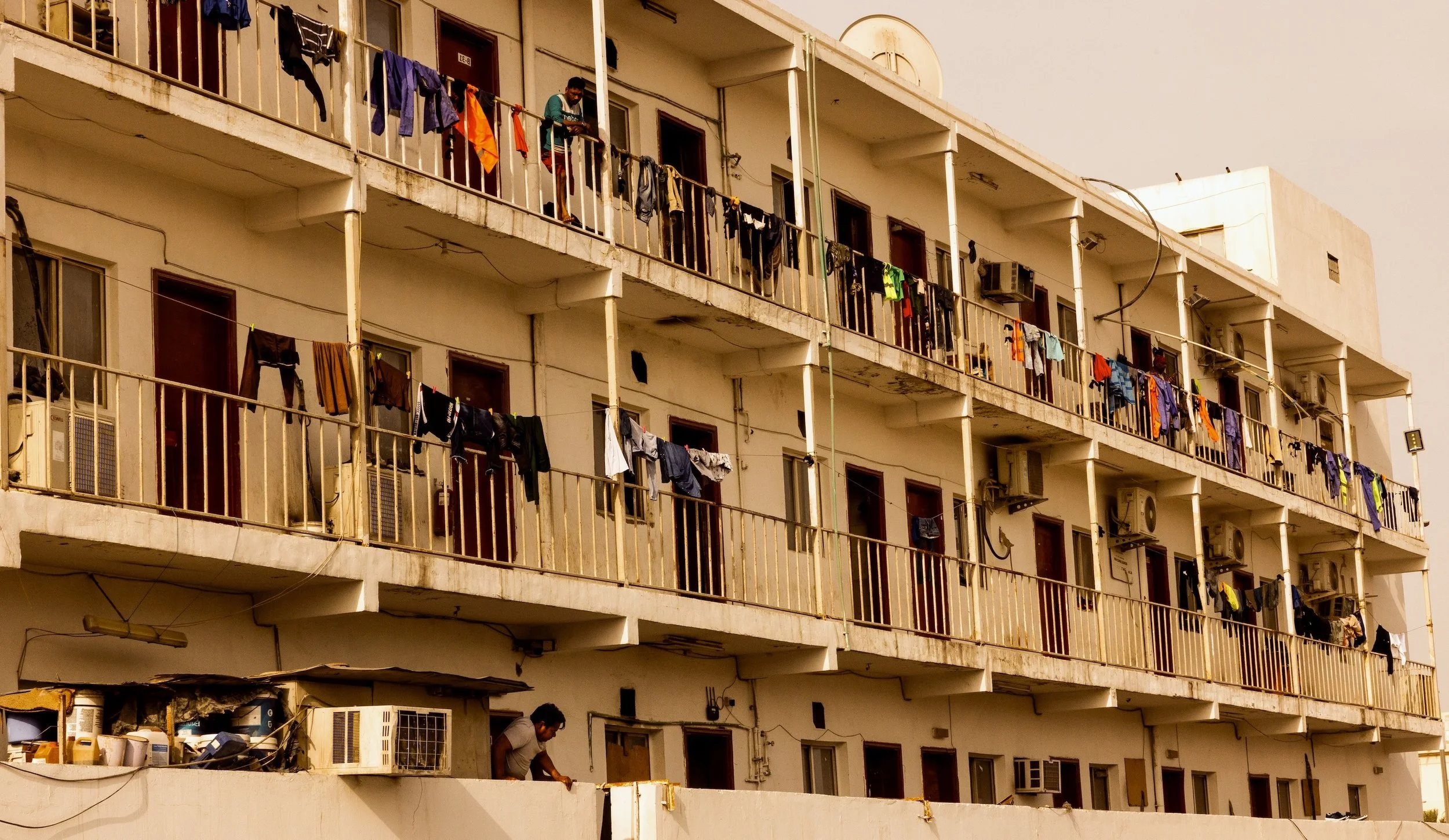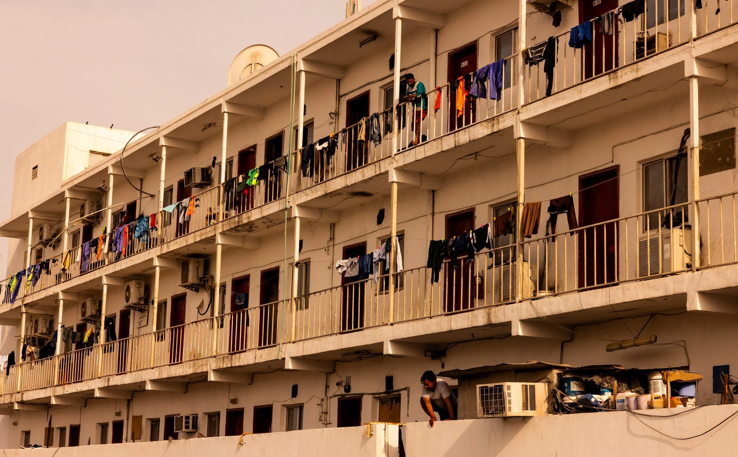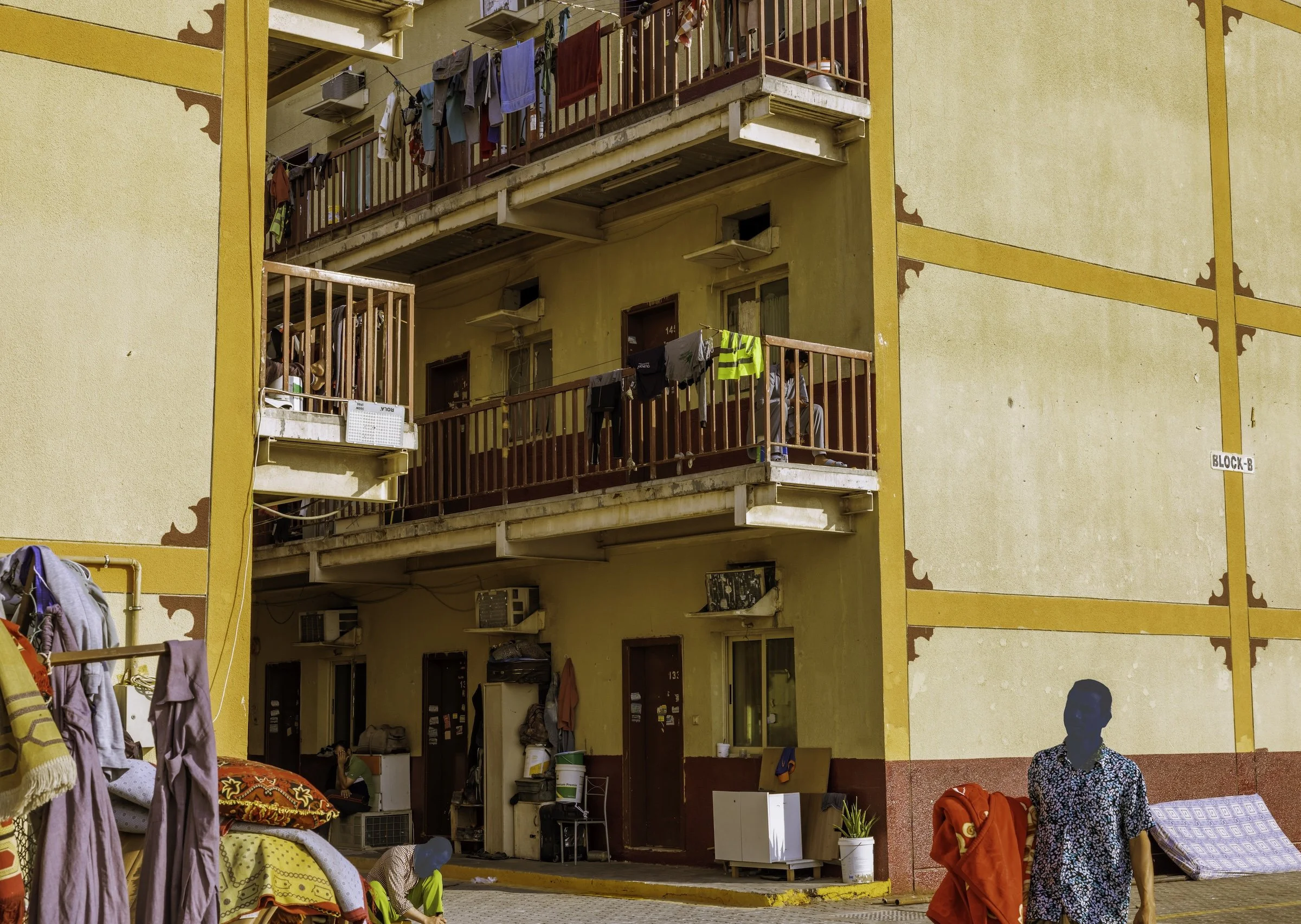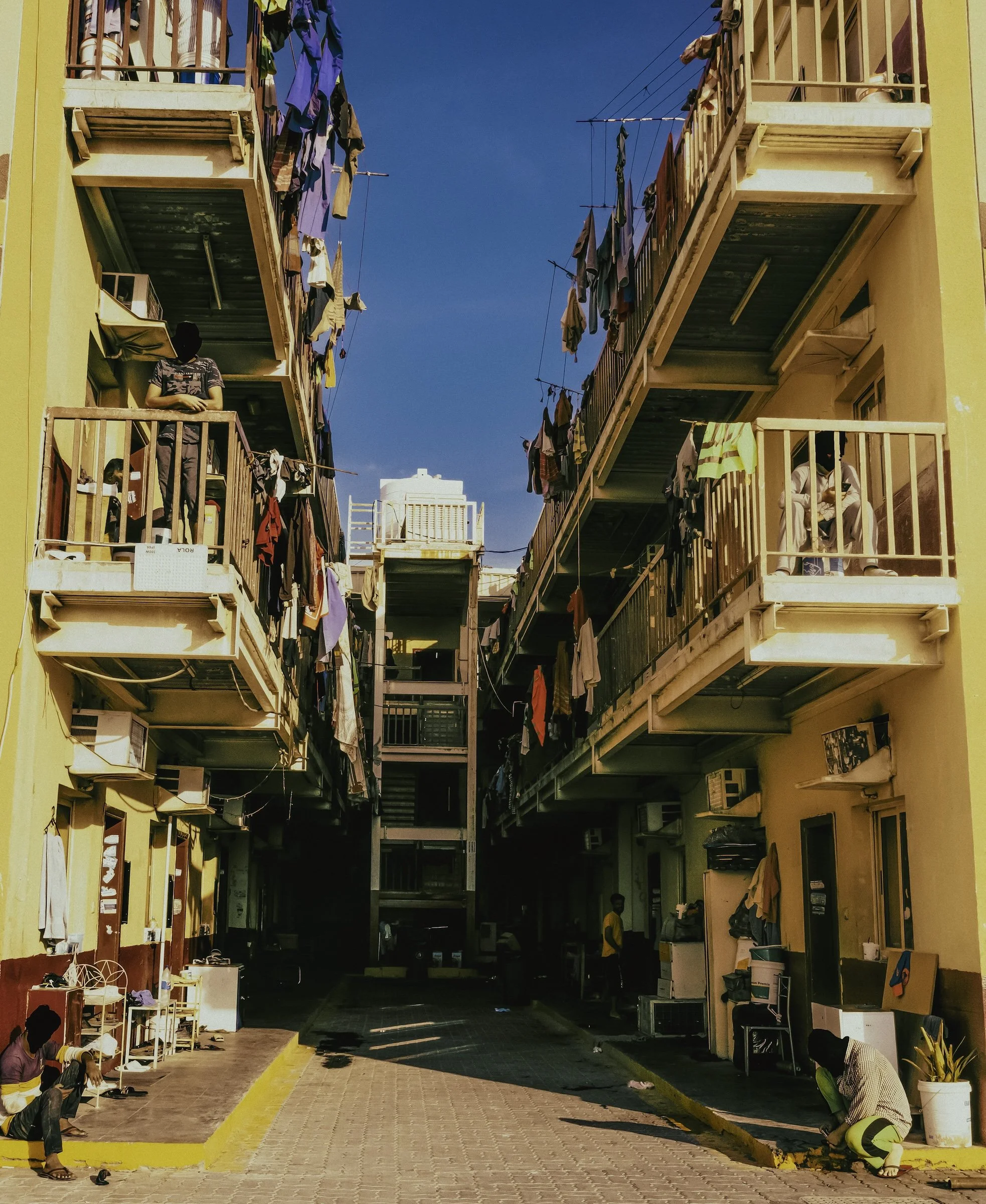 In 2023, I documented through photography and video, living conditions and lives of migrant laborers in Dubai and Doha, recording conversations with them. I documented snippets of their lives: weekend soccer games on makeshift fields, shopping at improvised roadside bazaars, laundry and clothing cascading from balconies in vertical neighborhoods where not a single woman is visible—reminders of families left behind. Since majority of the laborers are from South Asia, as a South Asian and Pakistani, shared language and homeland helped me gain limited access to their neighborhoods, allowing me to capture glimpses of their lives and conversations revealing both resilience and vulnerability.