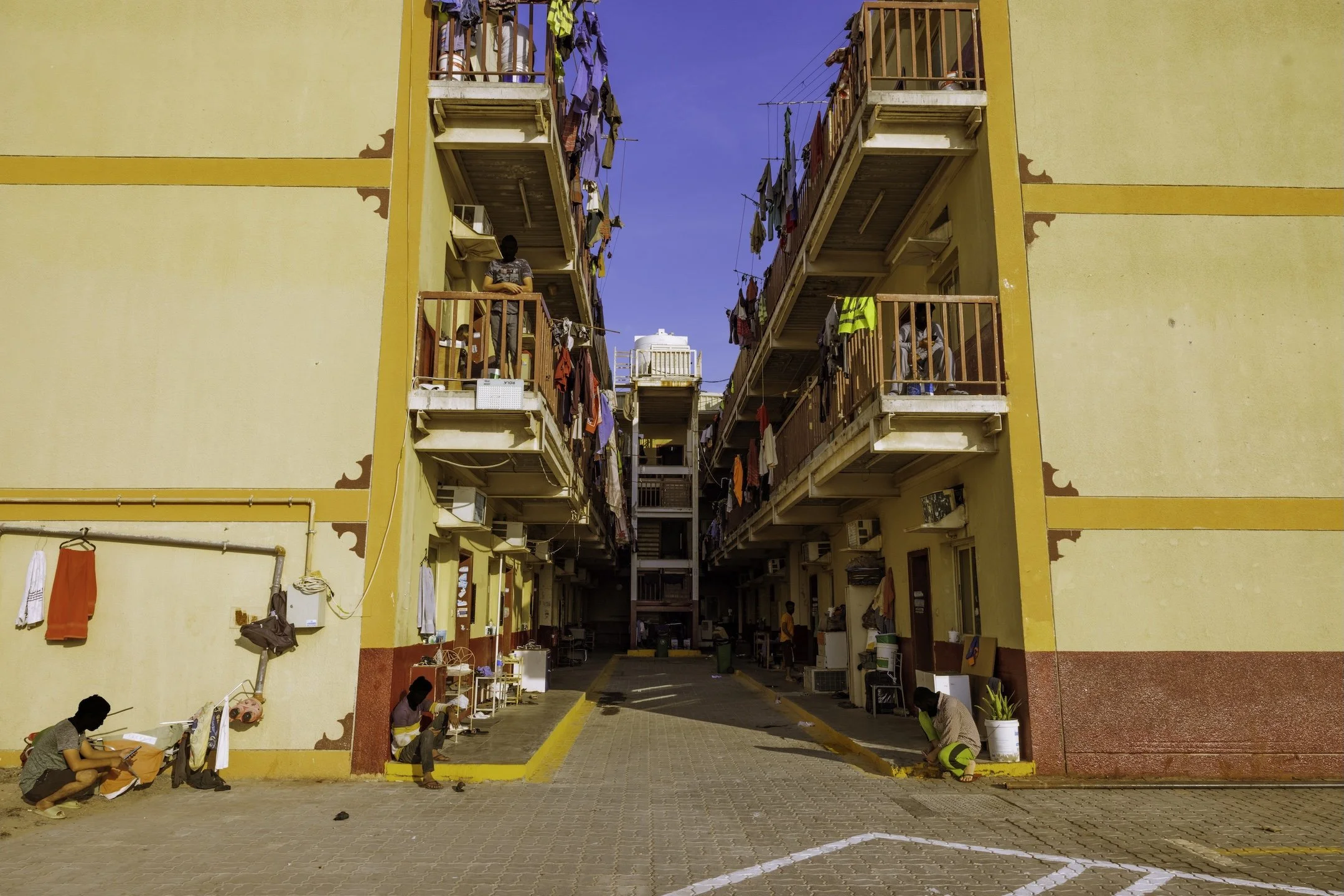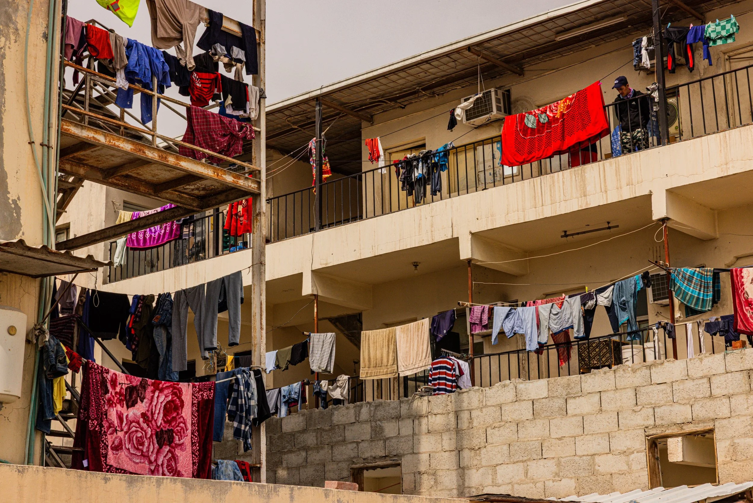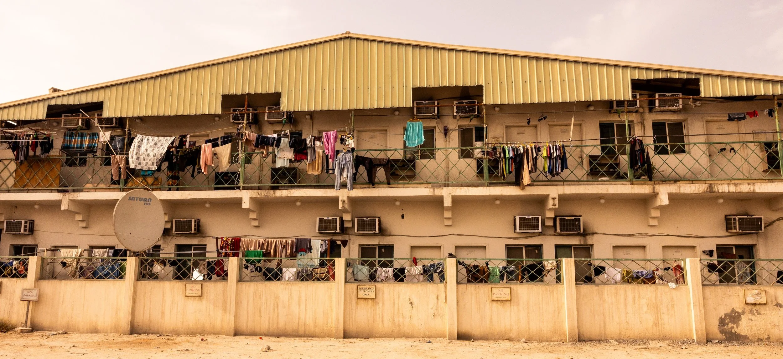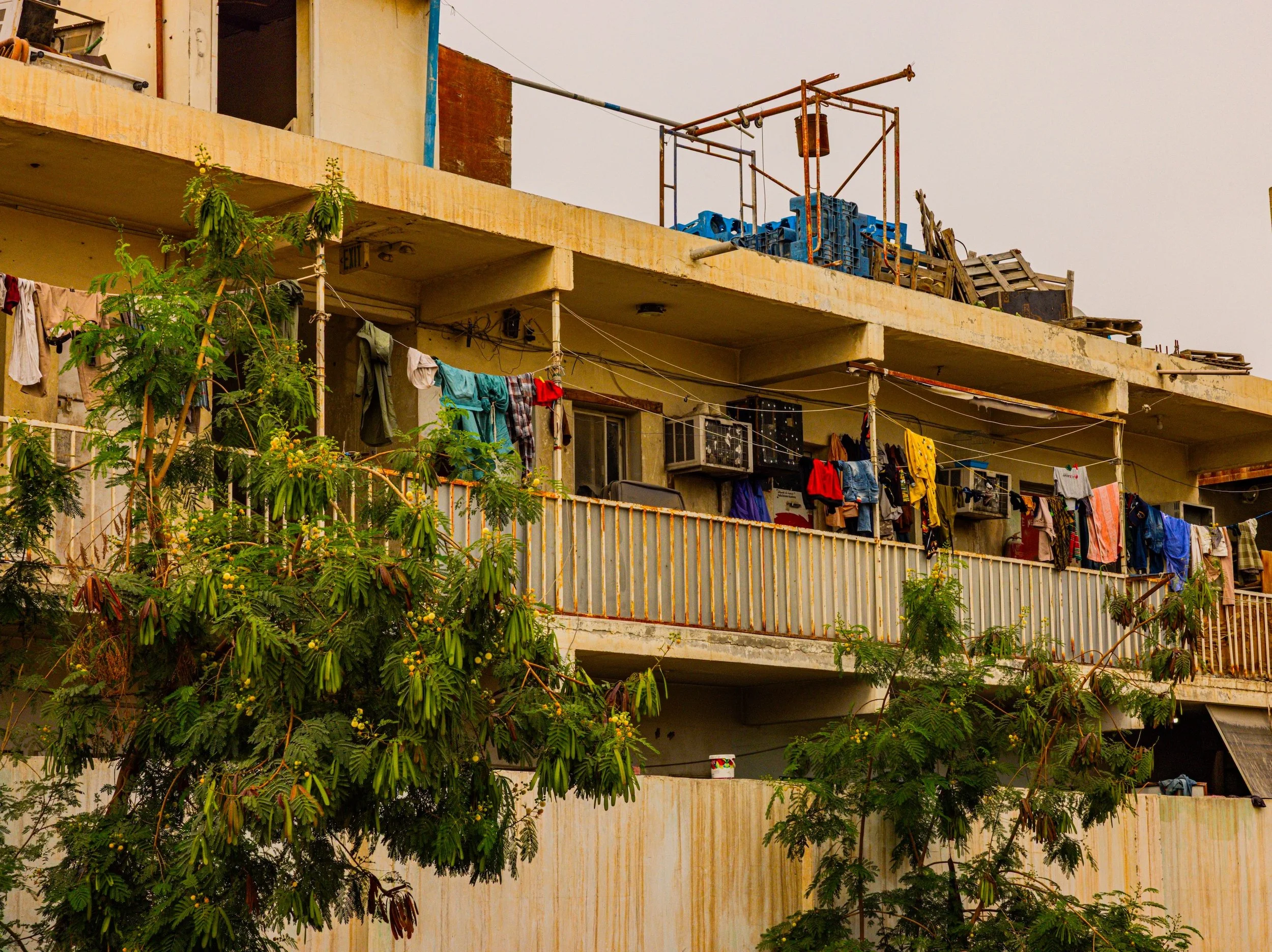 In 2023, I documented through photography and video, living conditions and lives of migrant laborers in Dubai and Doha, recording conversations with them. I documented snippets of their lives: weekend soccer games on makeshift fields, shopping at improvised roadside bazaars, laundry and clothing cascading from balconies in vertical neighborhoods where not a single woman is visible—reminders of families left behind. Since majority of the laborers are from South Asia, as a South Asian and Pakistani, shared language and homeland helped me gain limited access to their neighborhoods, allowing me to capture glimpses of their lives and conversations revealing both resilience and vulnerability.