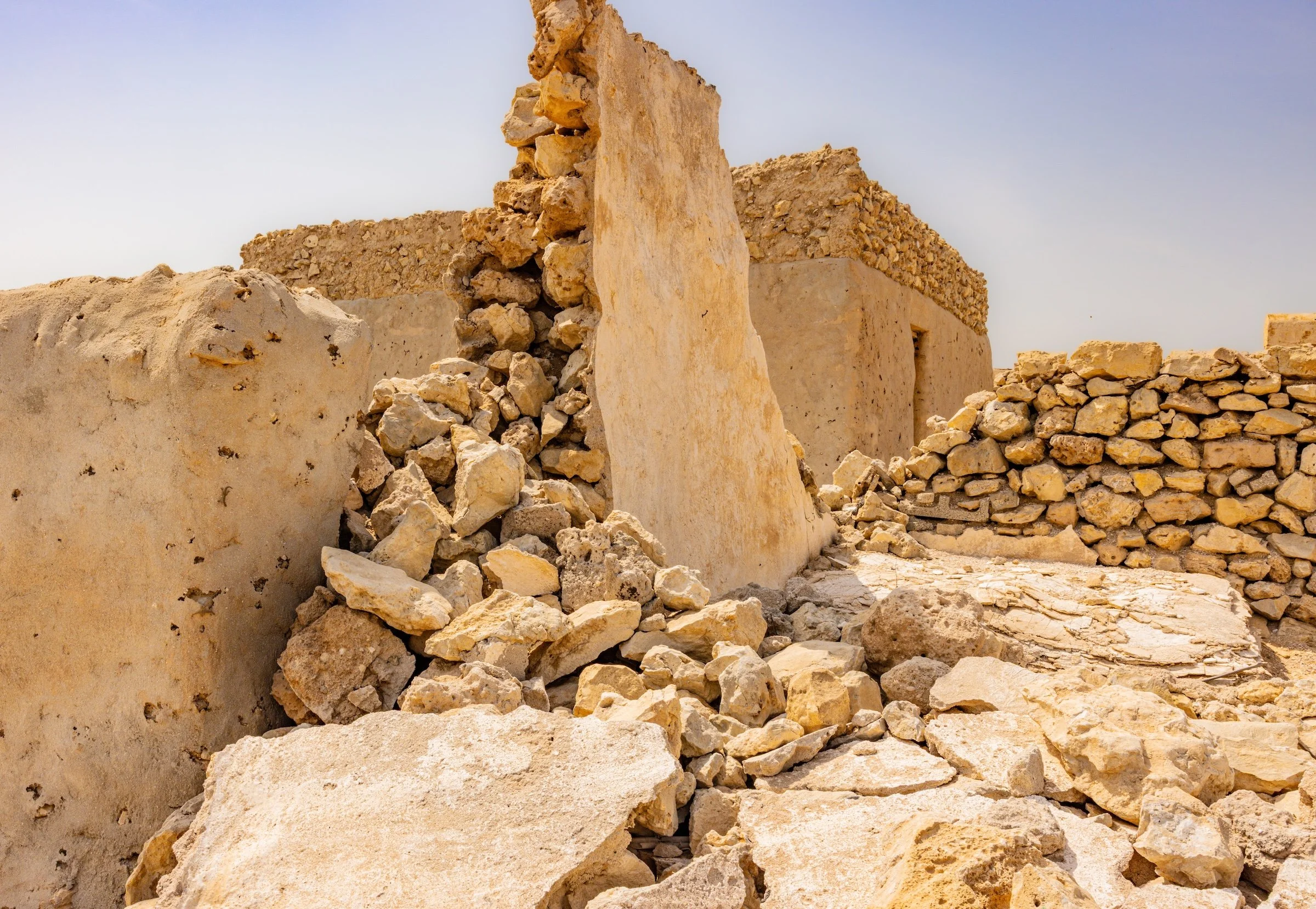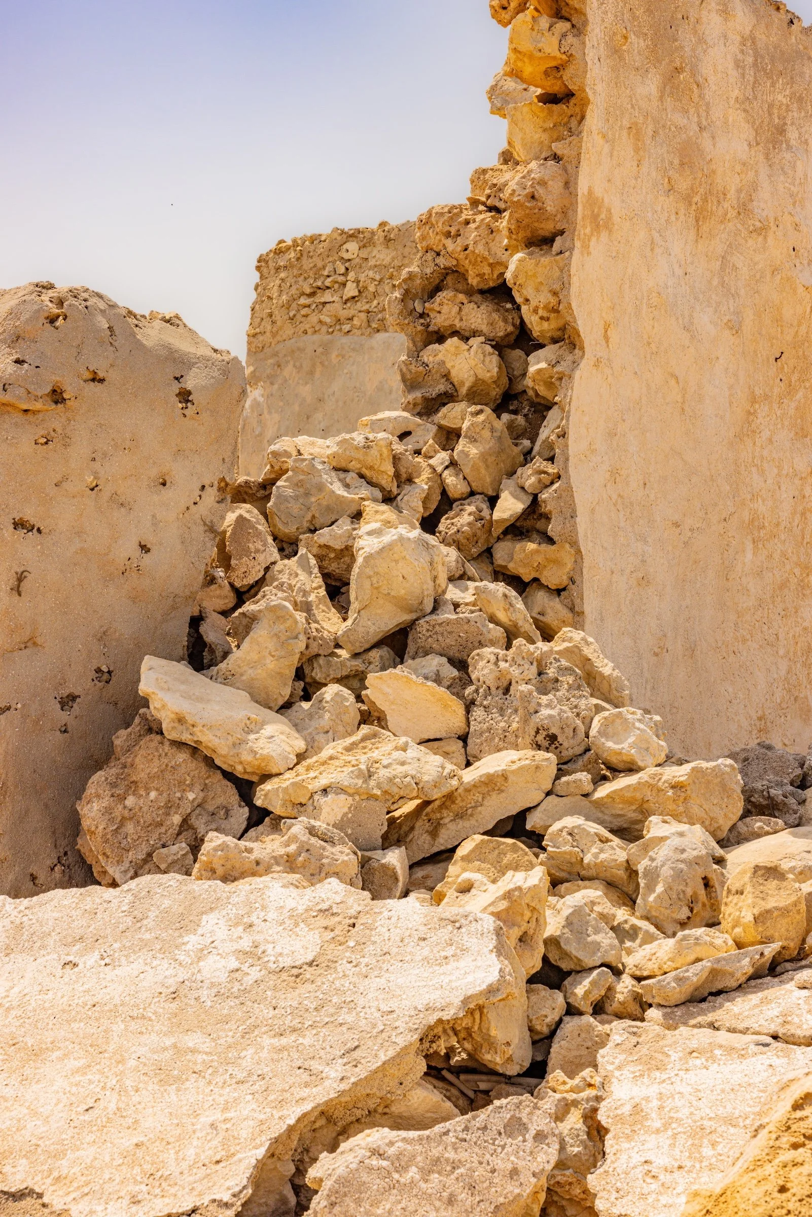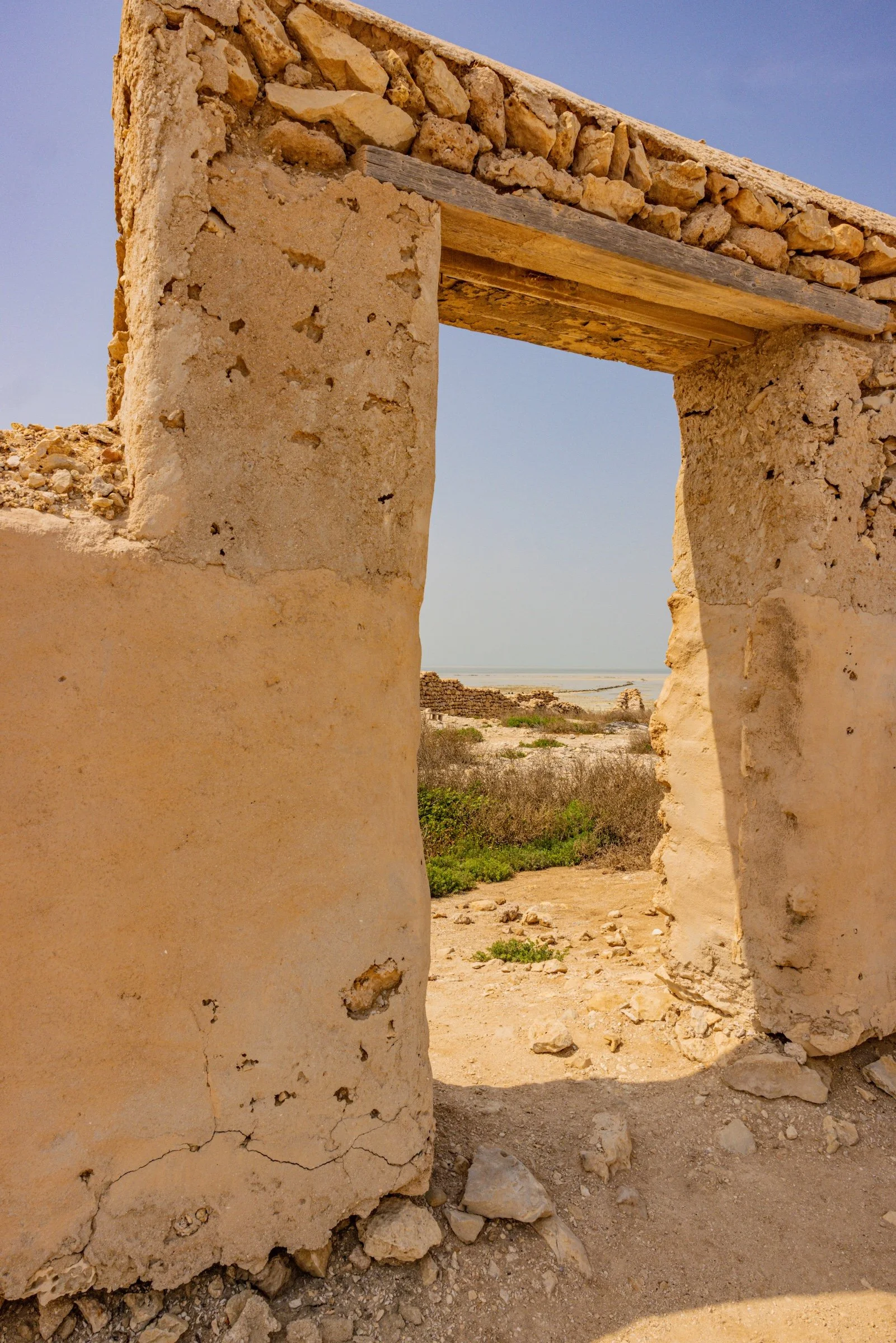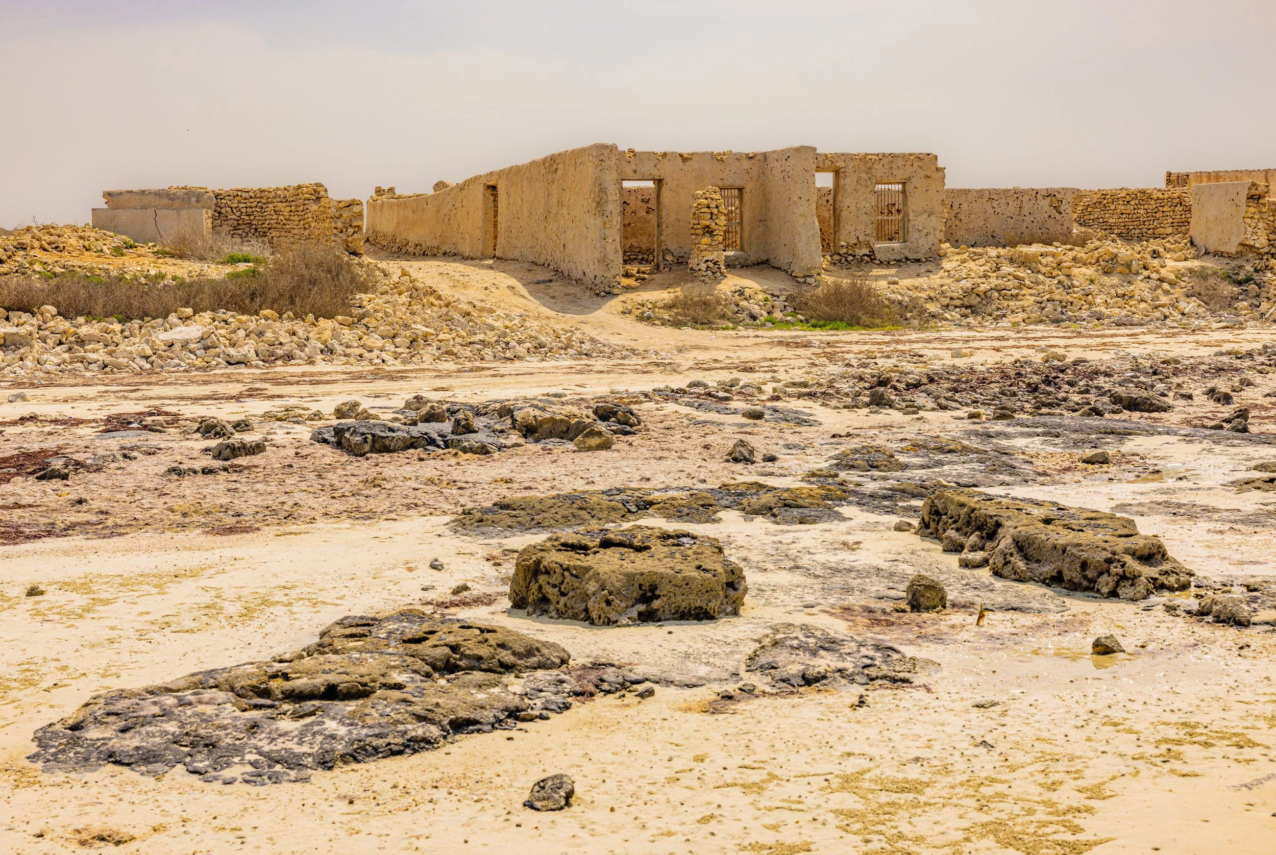 Al Jumail—named after the Arabic word jameel, meaning beautiful—is a haunting remnant of Qatar’s maritime past. One of the oldest settlements in Qatar, once a thriving 19th-century pearling and fishing village, it now rests in silence along the northwest coast, its coral-stone homes echoing a life once bound to the rhythms of the sea. Abandoned in the shadow of Qatar’s oil and gas economic boom, Al Jumail stands as a ghost town—a fragile monument to resilience, tradition, and the quiet poetry of a vanished way of life. The modern economic booms marked by swift urban expansion and the mass arrival of migrant laborers, who constructed the glittering skyline of contemporary Qatar. The dramatic rocks on the coast create a surreal landscape. The interplay between crumbling ruins and eroded stones echoes the quiet weight of migrant journeys—each fragment a testament, as the land itself bears silent witness.