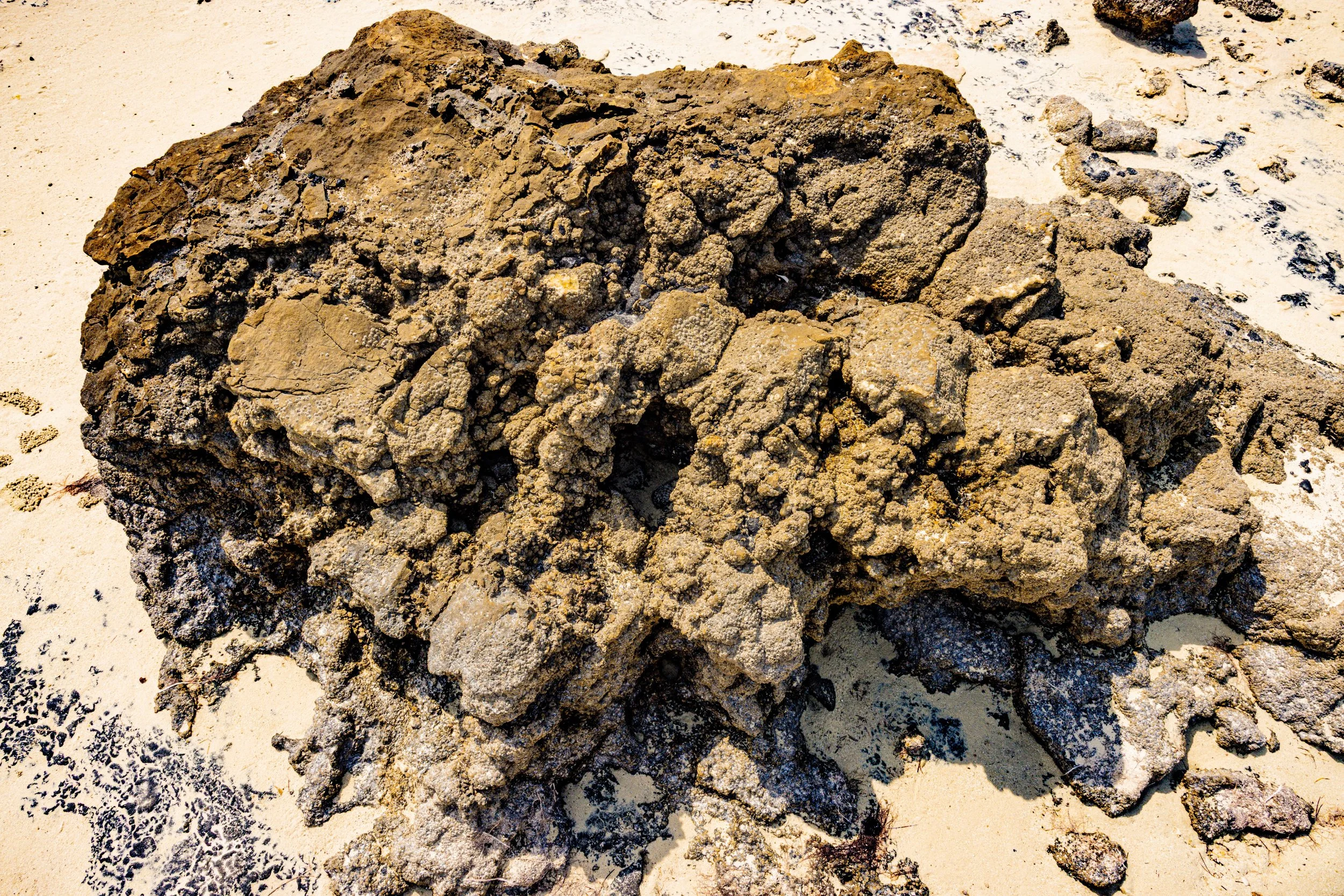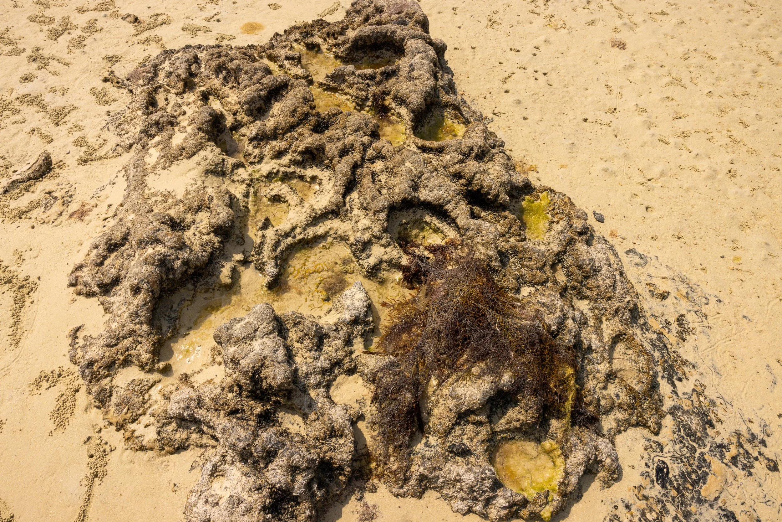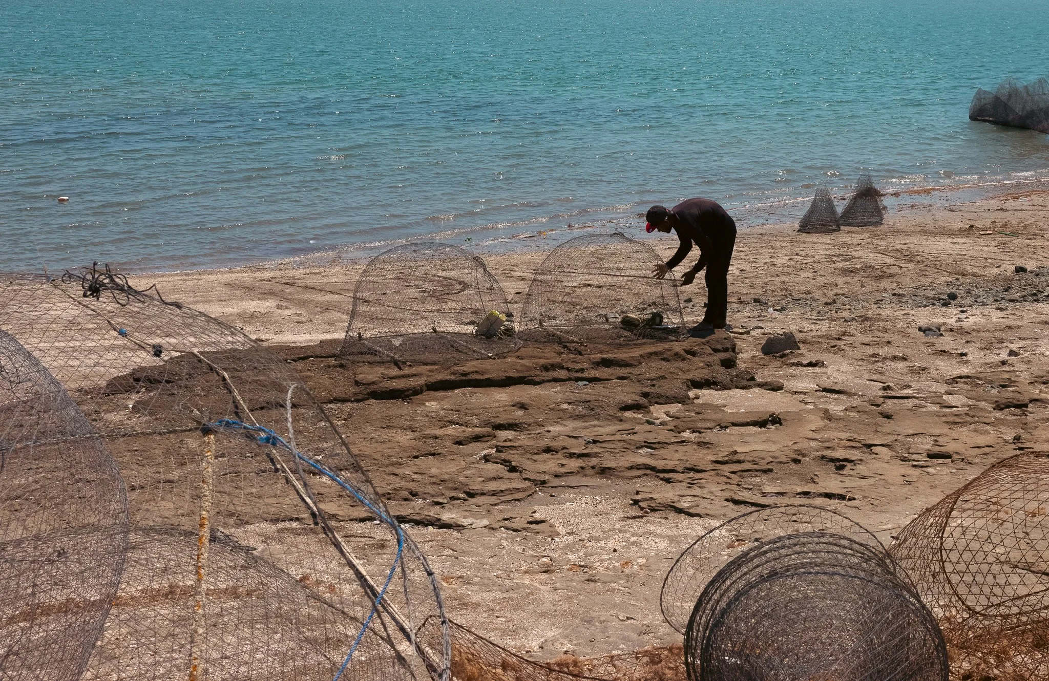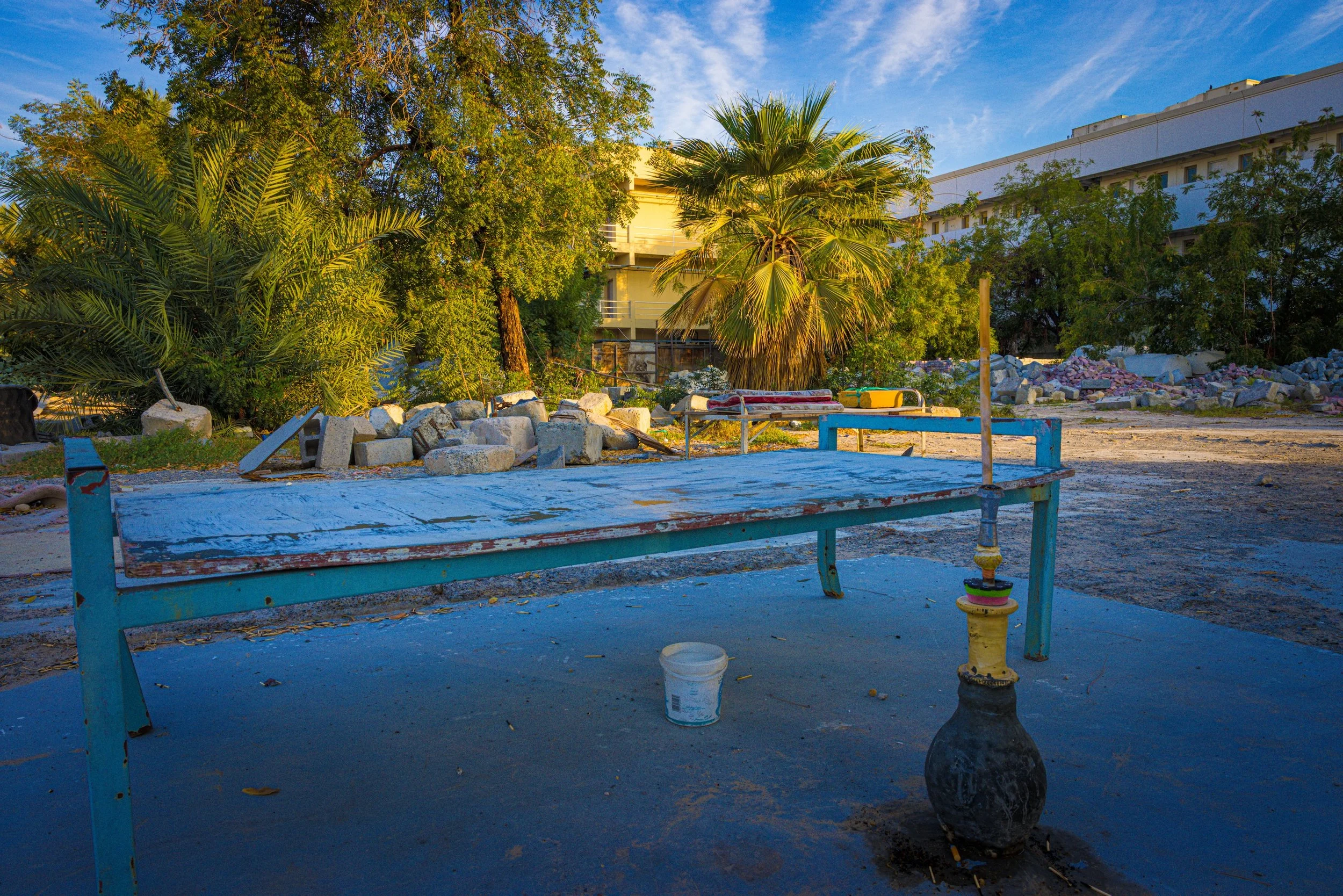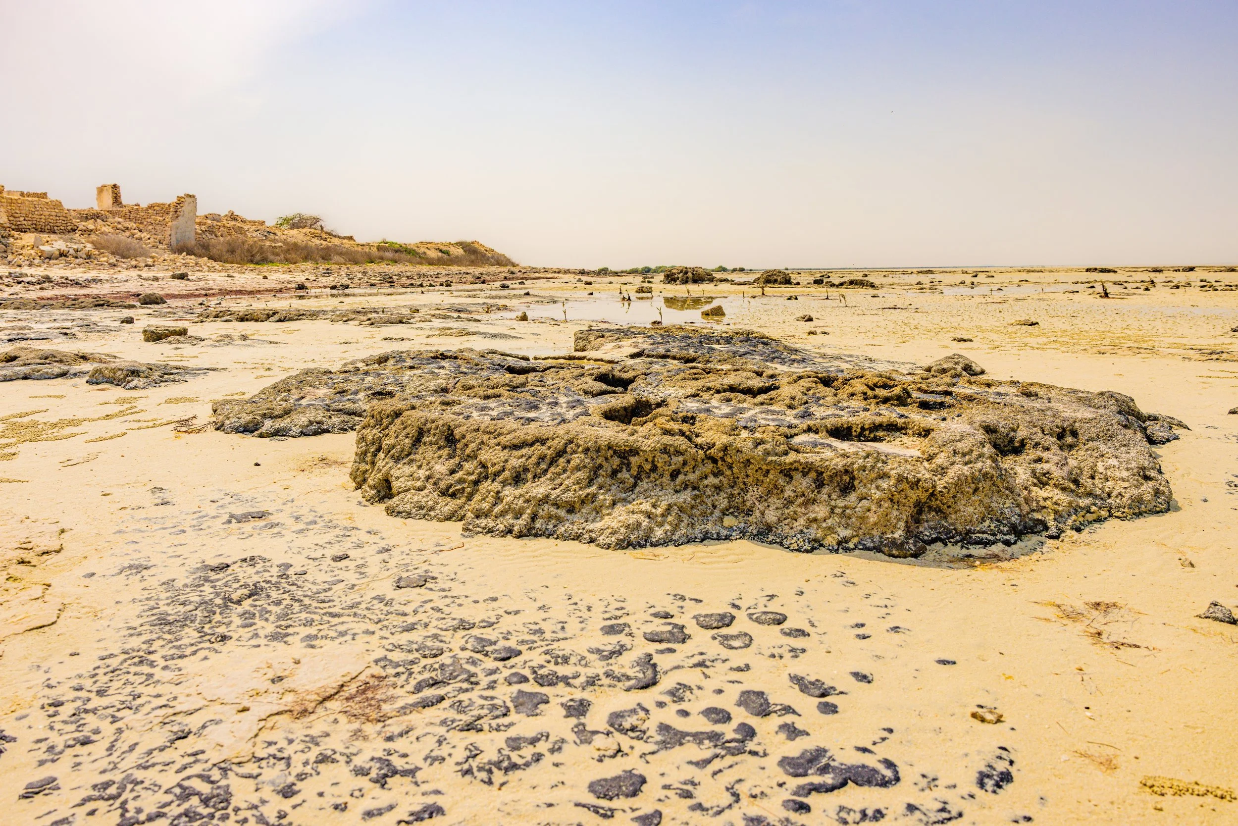Al Jumail—named after the Arabic word jameel, meaning beautiful—is a haunting remnant of Qatar’s maritime past. One of the oldest settlements in Qatar, once a thriving 19th-century pearling and fishing village, it now rests in silence along the northwest coast, its coral-stone homes echoing a life once bound to the rhythms of the sea. Abandoned in the shadow of Qatar’s oil and gas economic boom, Al Jumail stands as a ghost town—a fragile monument to resilience, tradition, and the quiet poetry of a vanished way of life. The modern economic booms marked by swift urban expansion and the mass arrival of migrant laborers, who constructed the glittering skyline of contemporary Qatar. The dramatic rocks on the coast create a surreal landscape. The interplay between crumbling ruins and eroded stones echoes the quiet weight of migrant journeys—each fragment a testament, as the land itself bears silent witness.