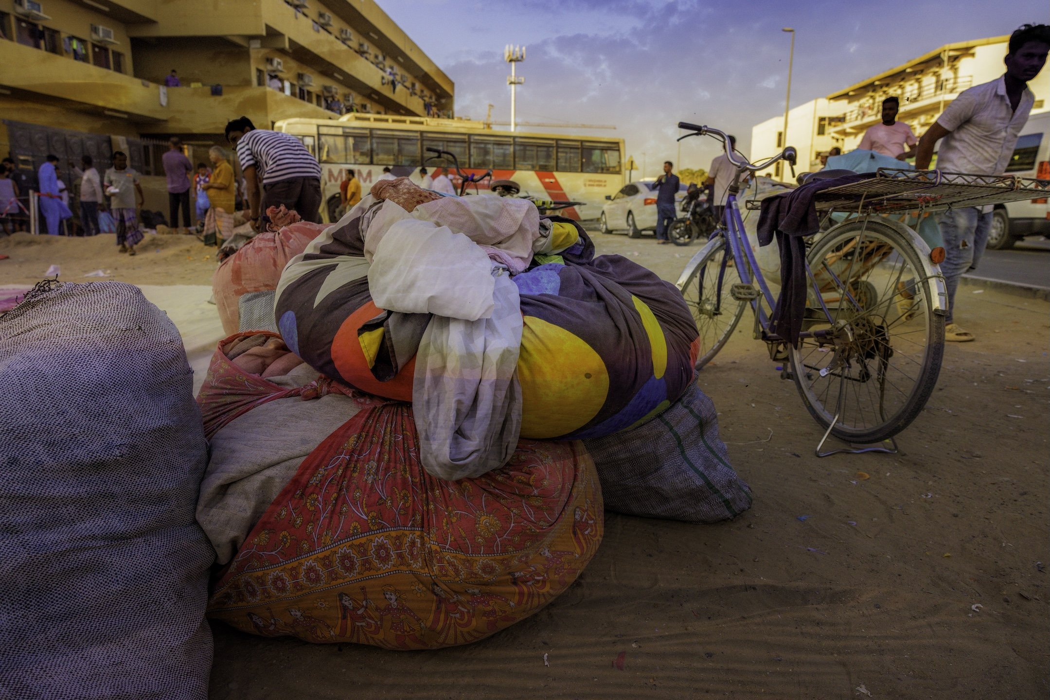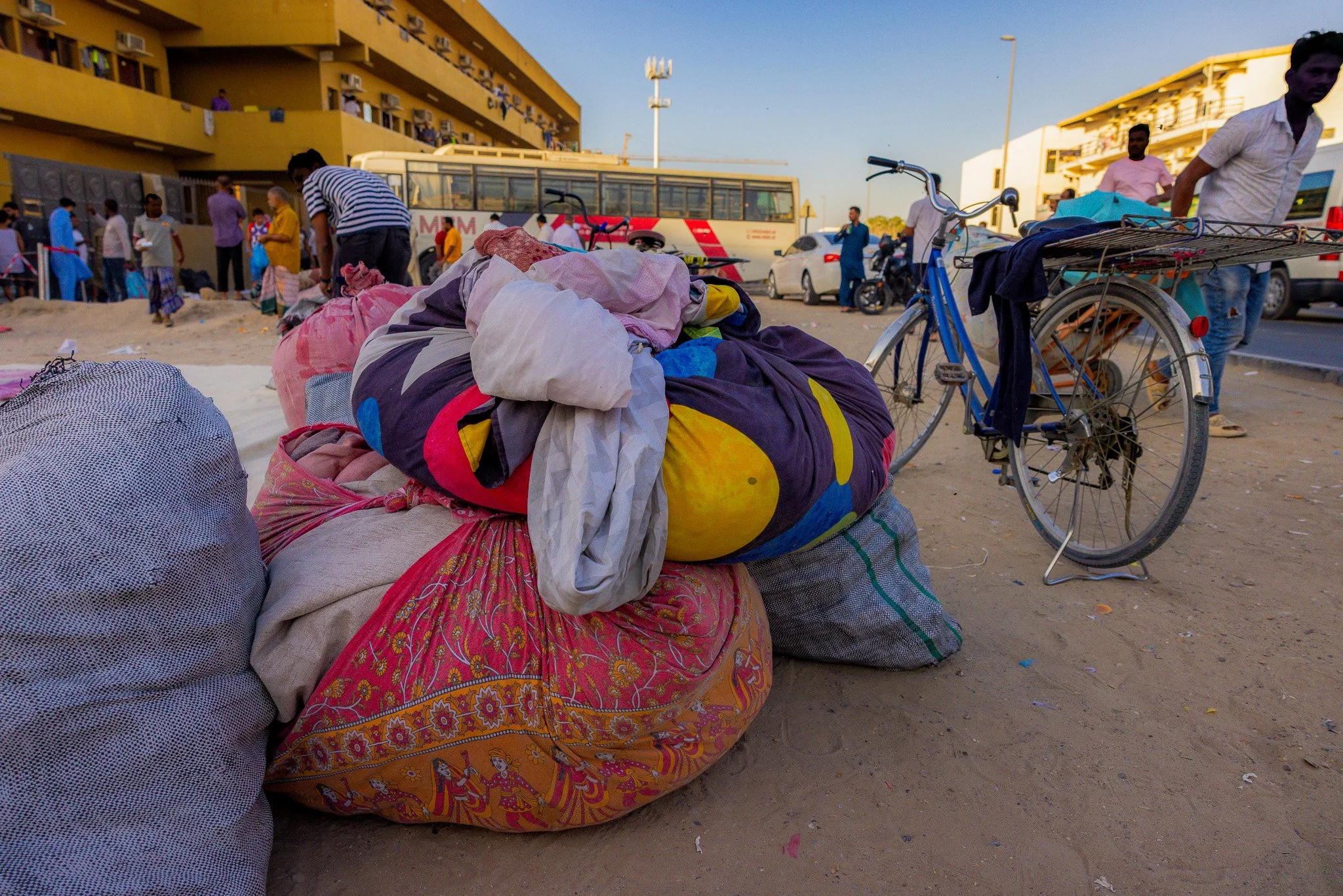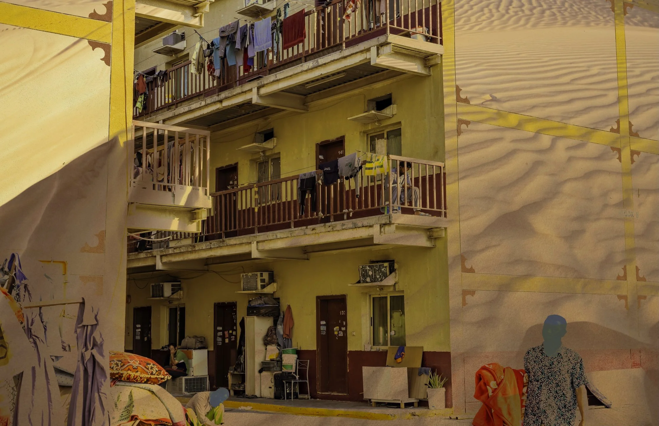 The wind-sculpted red dunes of the Lahbab desert stretch wide and open, a stark contrast to the dense, confined neighborhoods the migrant laborers inhabit. Their connection to this landscape may feel distant, yet both land and labor mirror resilience and endurance.