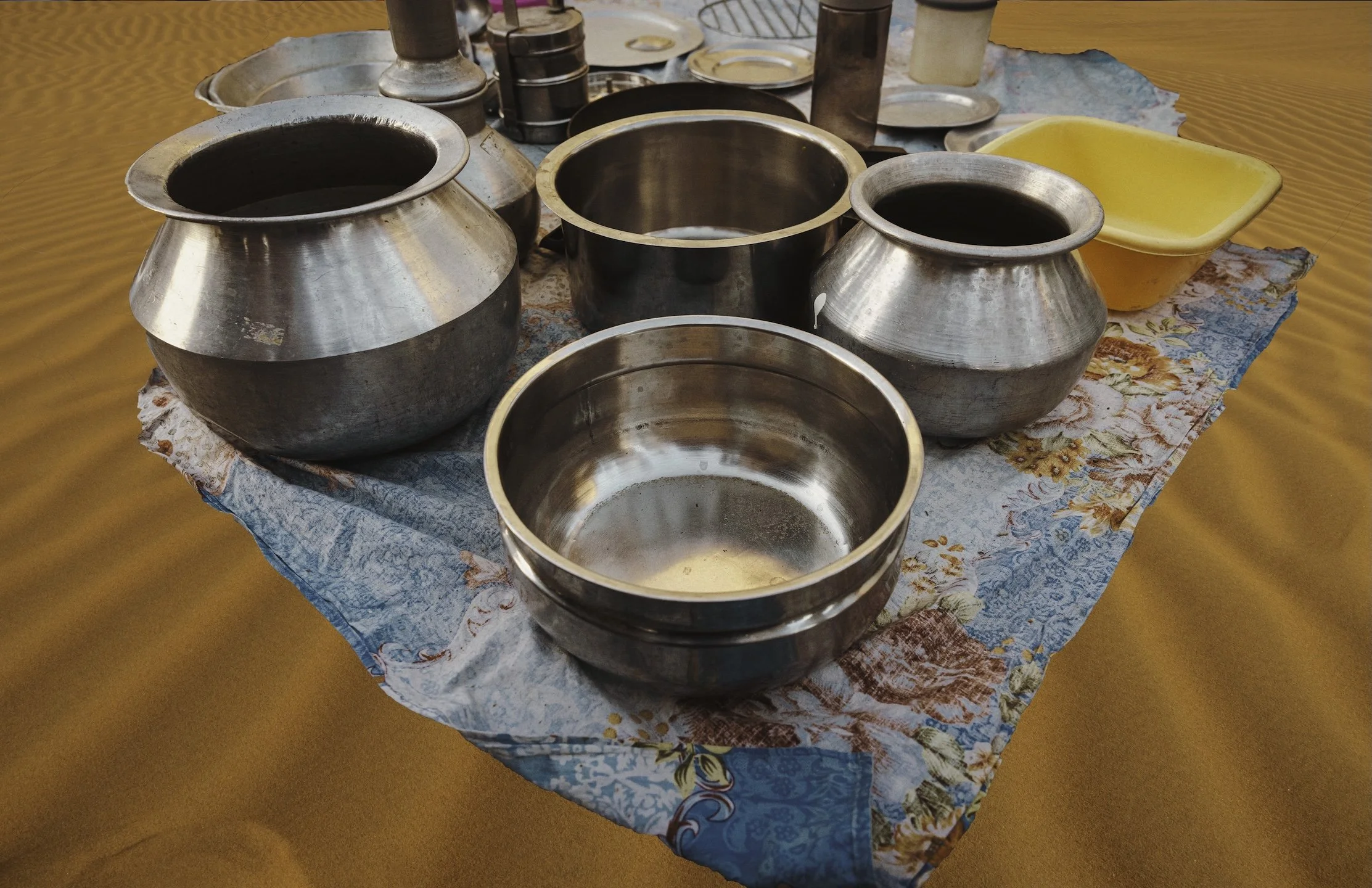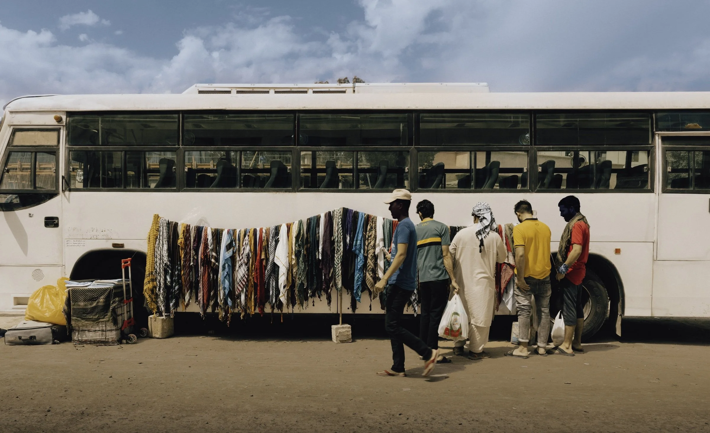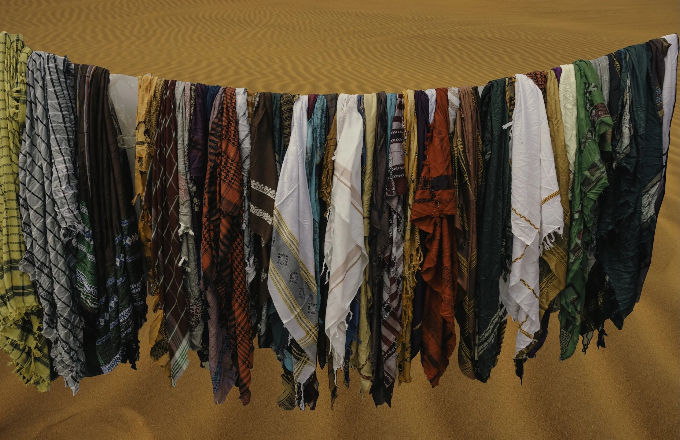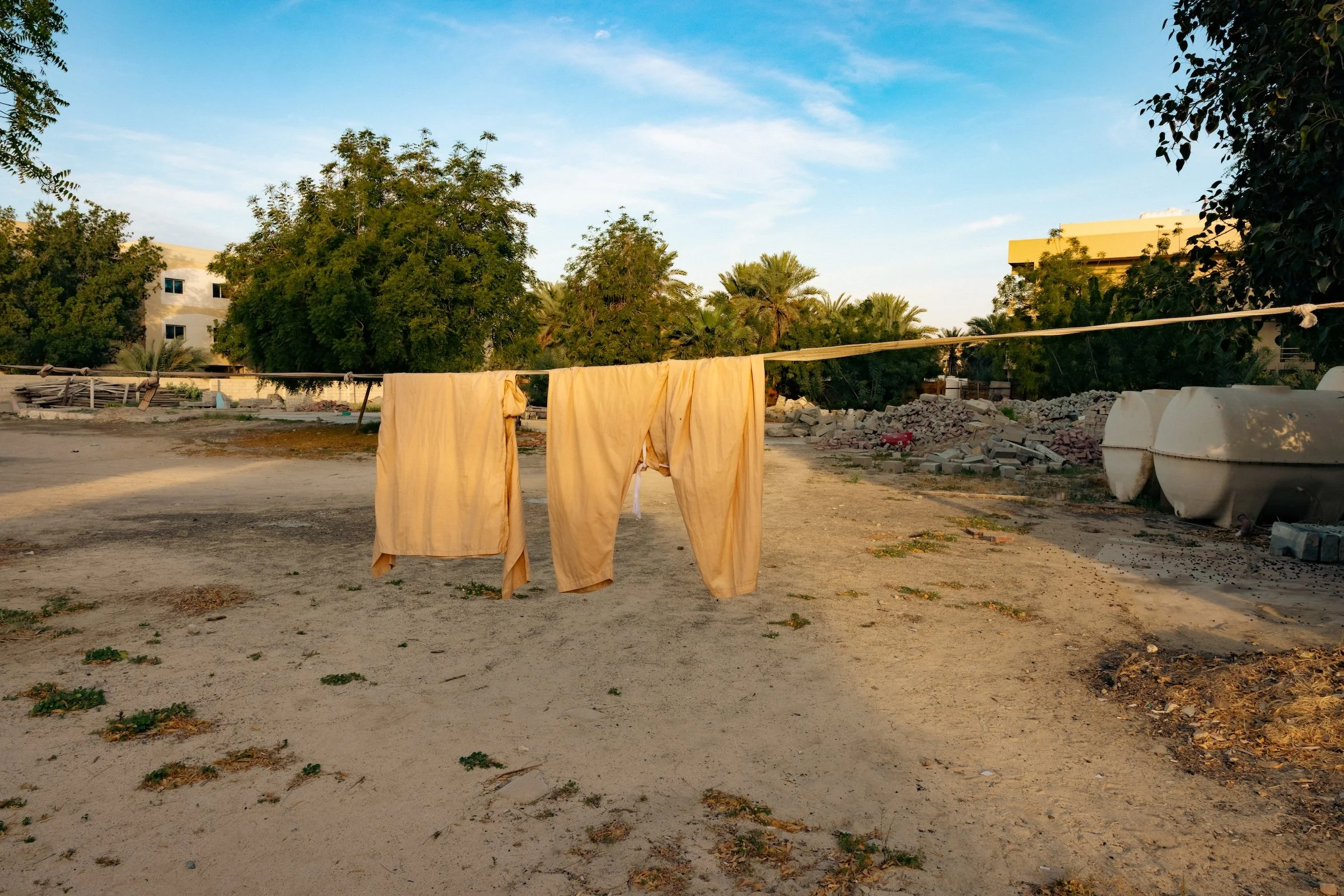 The wind-sculpted red dunes of the Lahbab desert stretch wide and open, a stark contrast to the dense, confined neighborhoods the migrant laborers inhabit. Their connection to this landscape may feel distant, yet both land and labor mirror resilience and endurance.