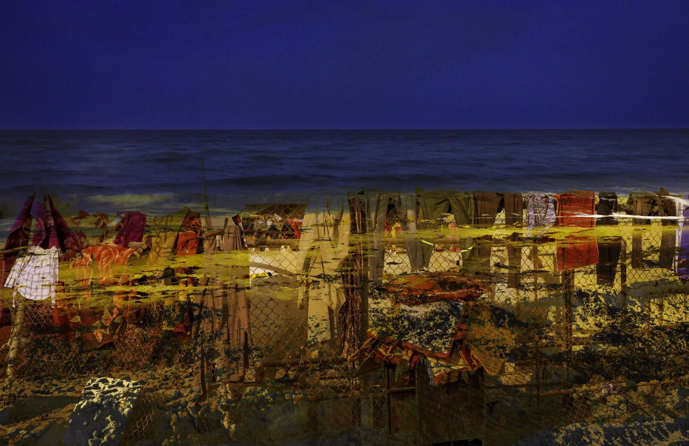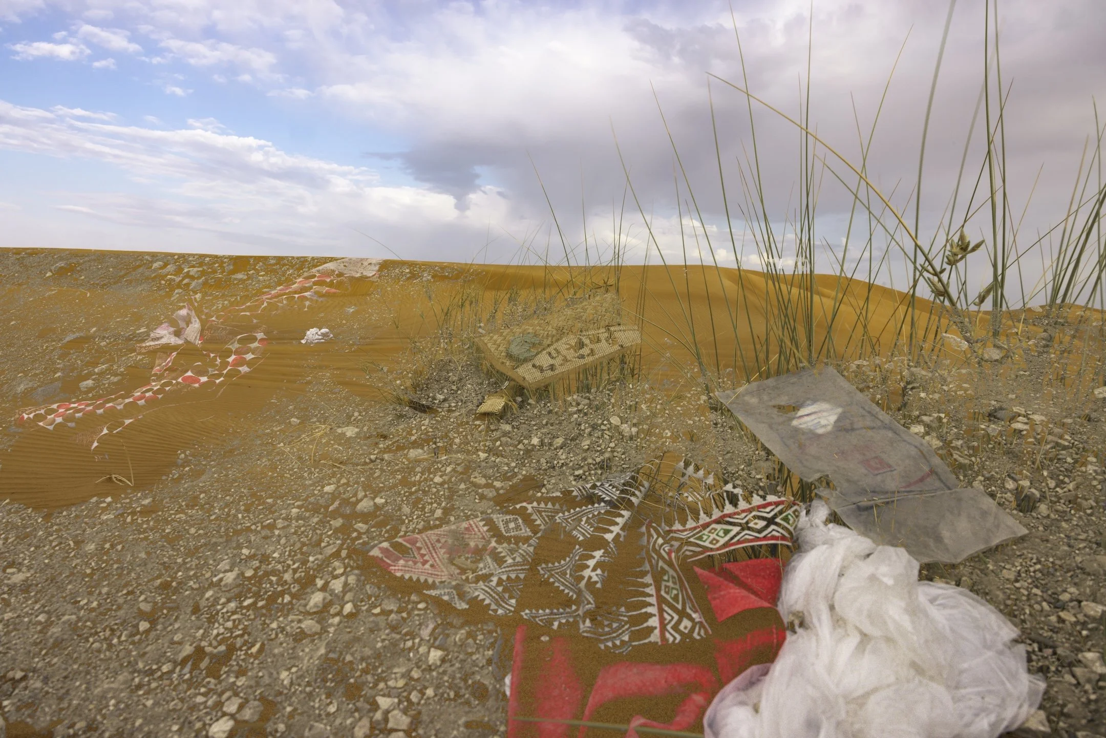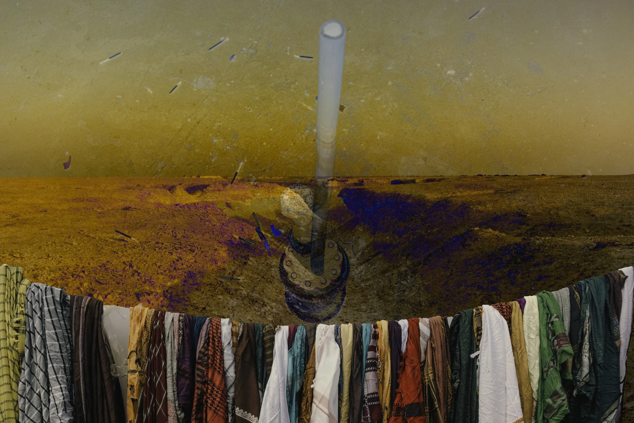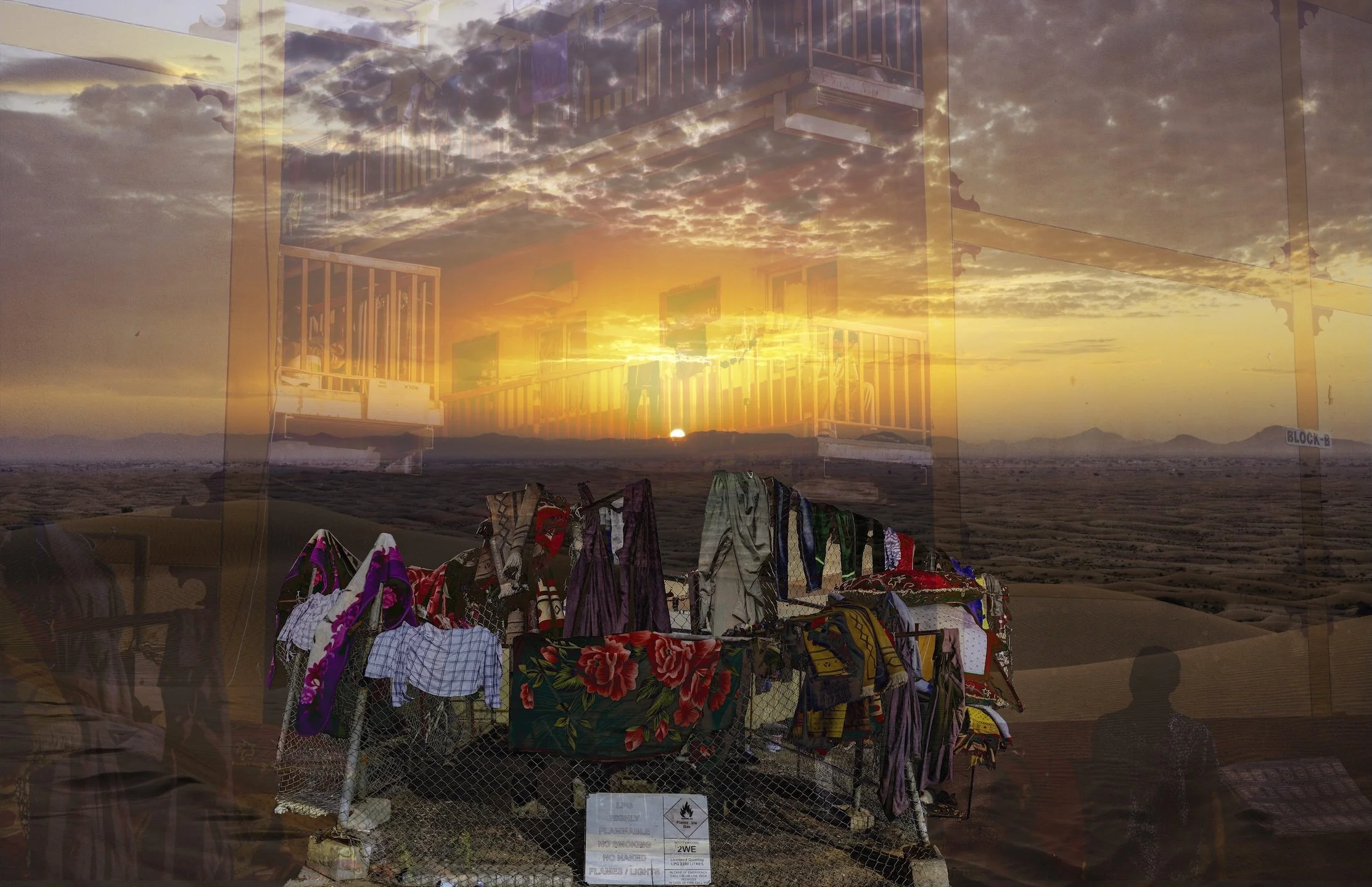 “The day…” is a multimedia project that weaves personal testimonies of South Asian indentured laborers in Dubai, United Arab Emirates, and Doha, Qatar with visual traces of their lived realities. Through collage, drawing, installation, photography, video, audio, and text, it reveals glimpses of hidden neighborhoods, makeshift roadside bazaars, and vernacular landscapes—spaces largely concealed from public view. These are starkly contrasted with the iconic skylines their labor helped construct. Distant glimpses of migrant housing, obscured from the outside world, are juxtaposed with the natural landscape of the region, heightening the tension and disconnect within a layered environment that exposes the contradictions underlying these glamorized urban centers. This immersive setting will be overlaid with personal reflections by those who leave home to labor in foreign lands alongside poetry by authors directly tied to South Asia. The project itself is one of a trio of inter-related works, together with Stories from the Core (Oklahoma, 2022) and Unearthing Stories from the Core (Pakistan, 2023). “The day…” fills a void in the visual arts, centering South Asian migrant workers and positions art as a conduit toward reckoning, reconciliation and healing.