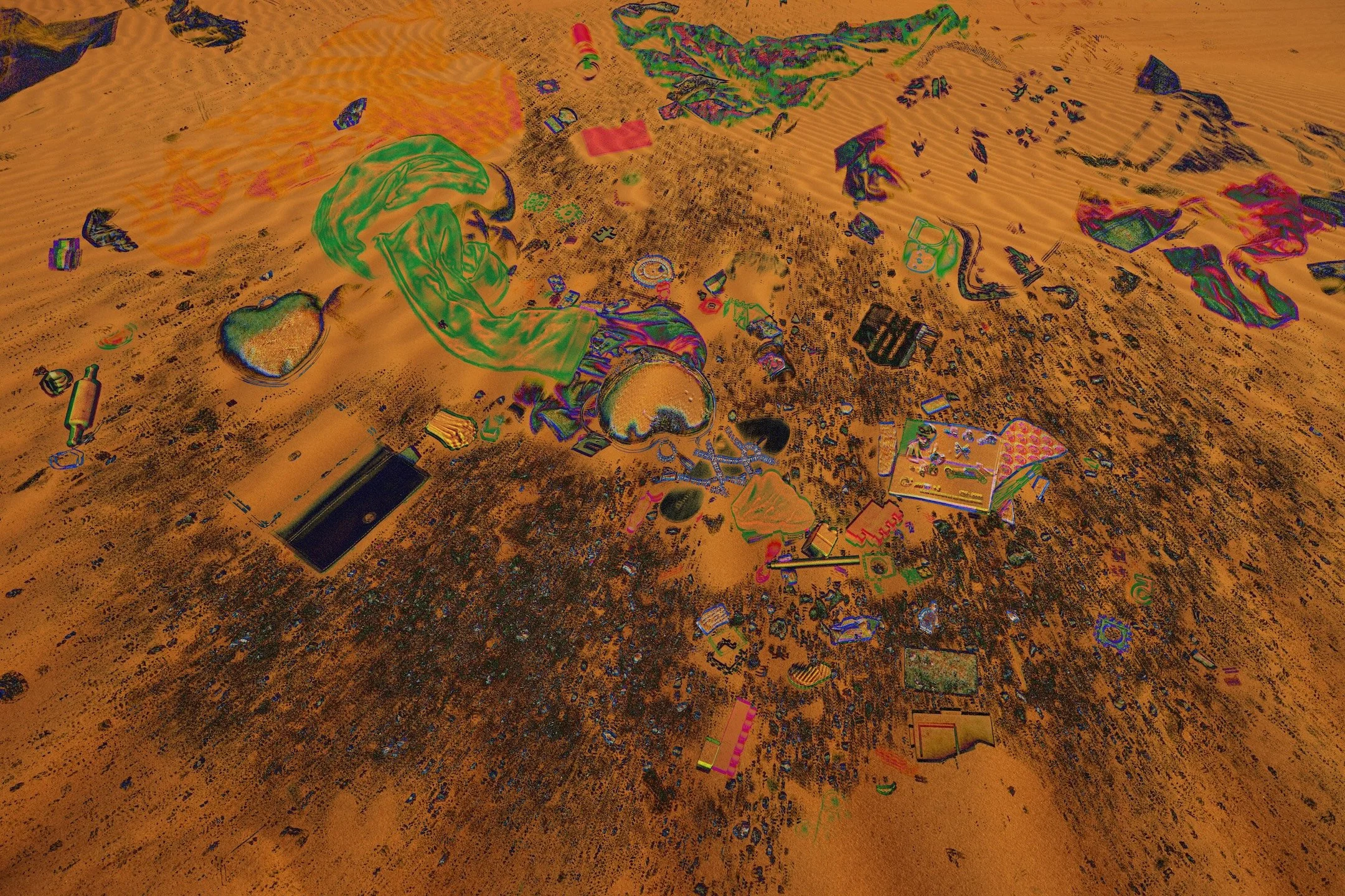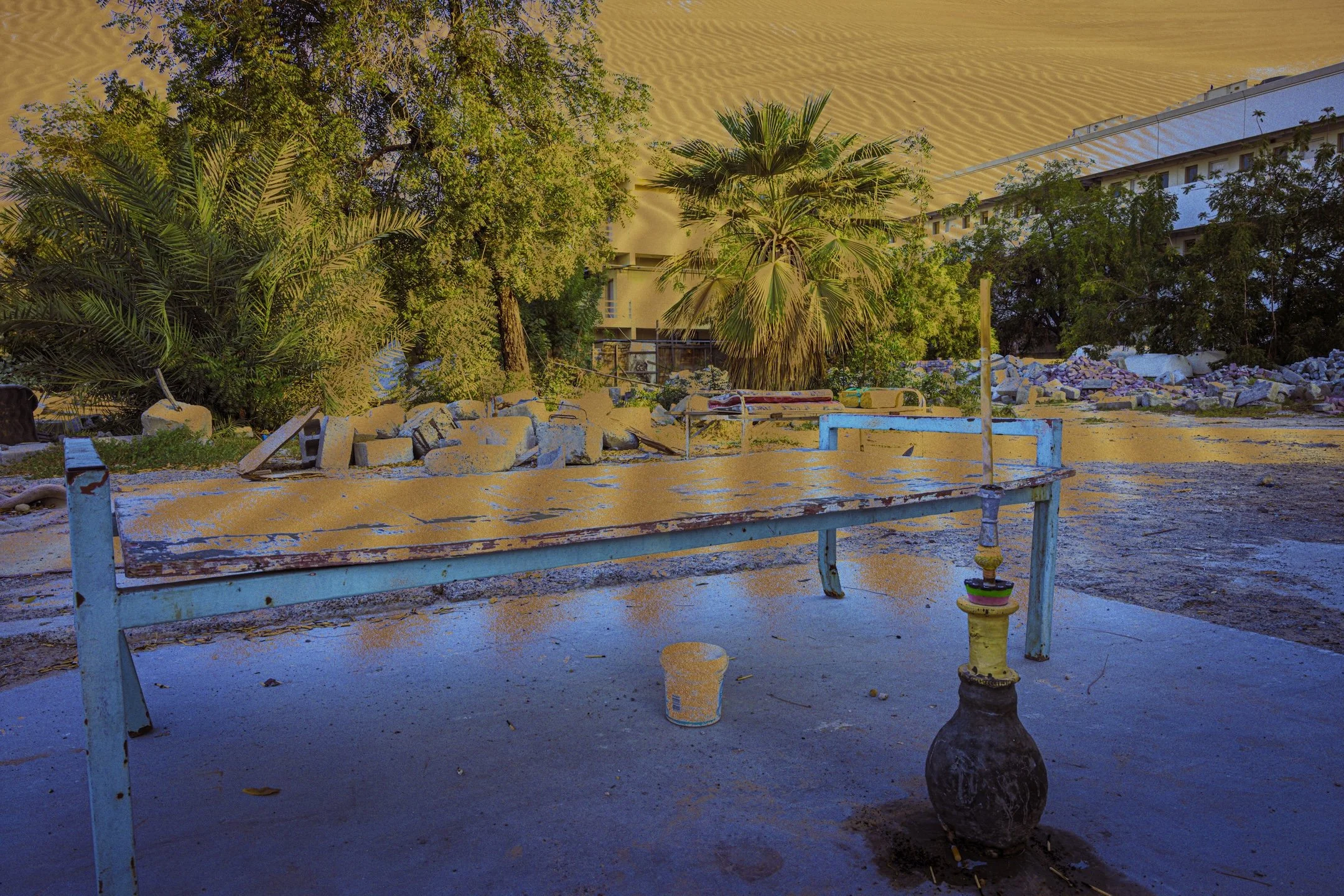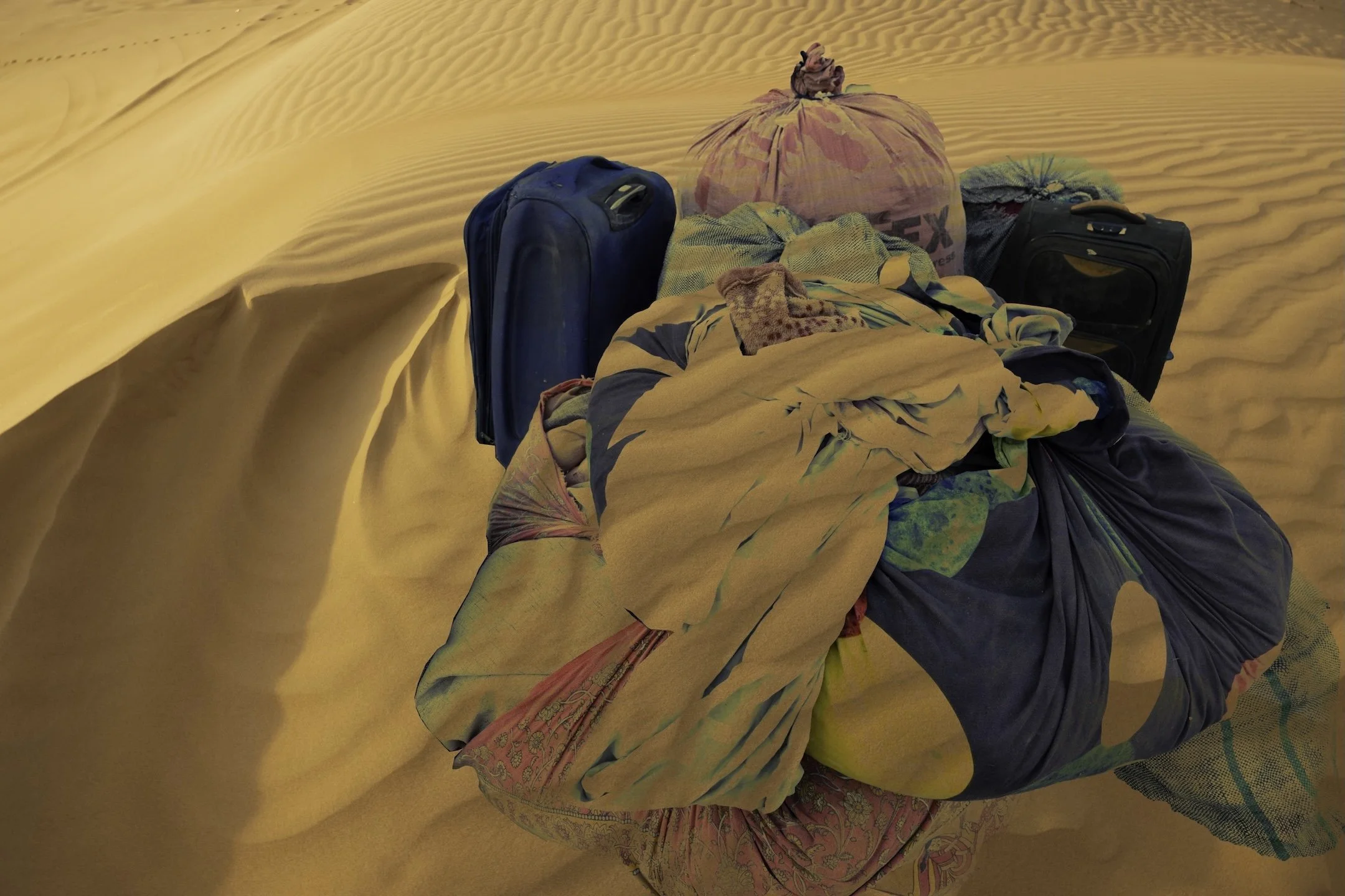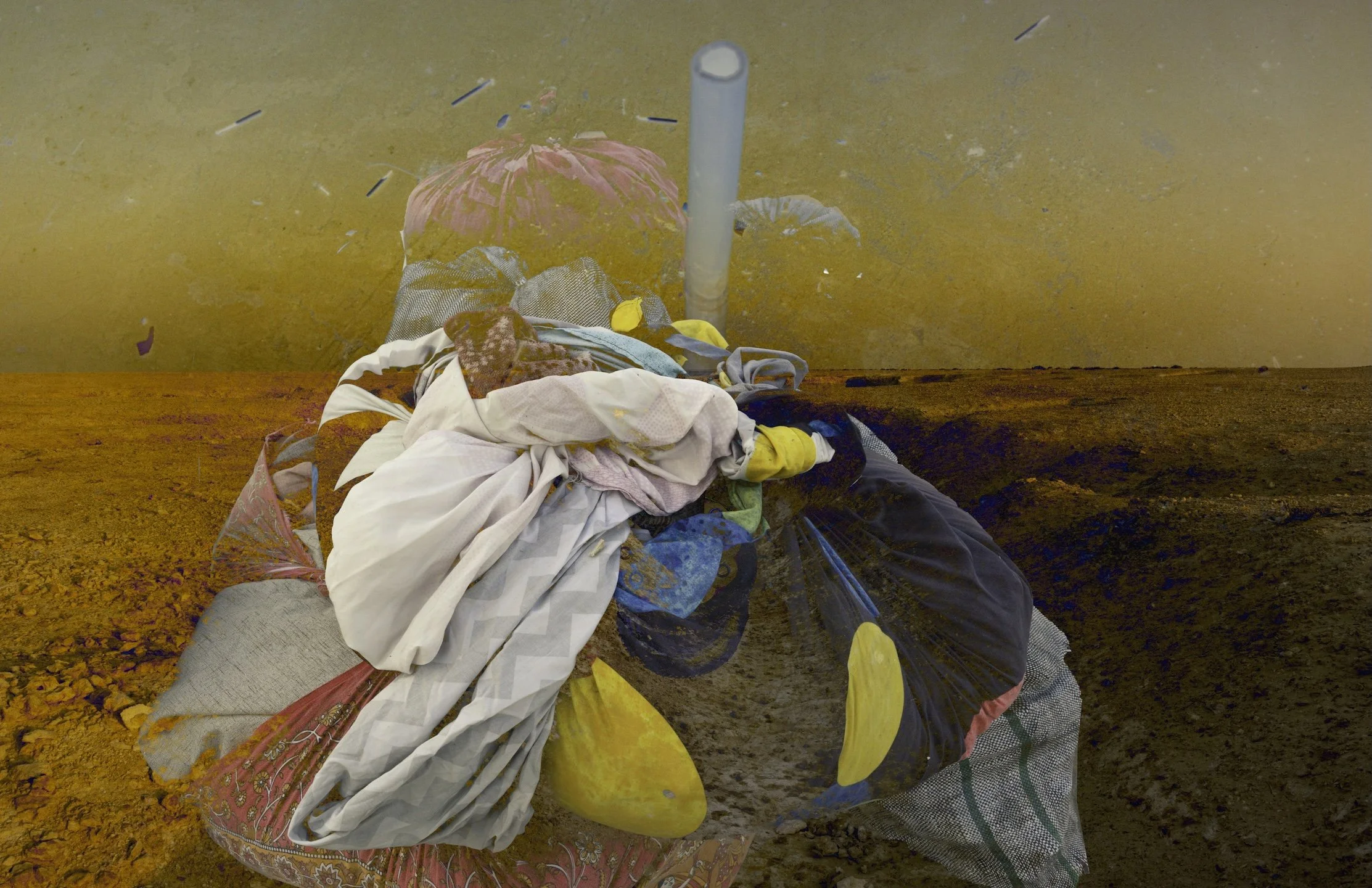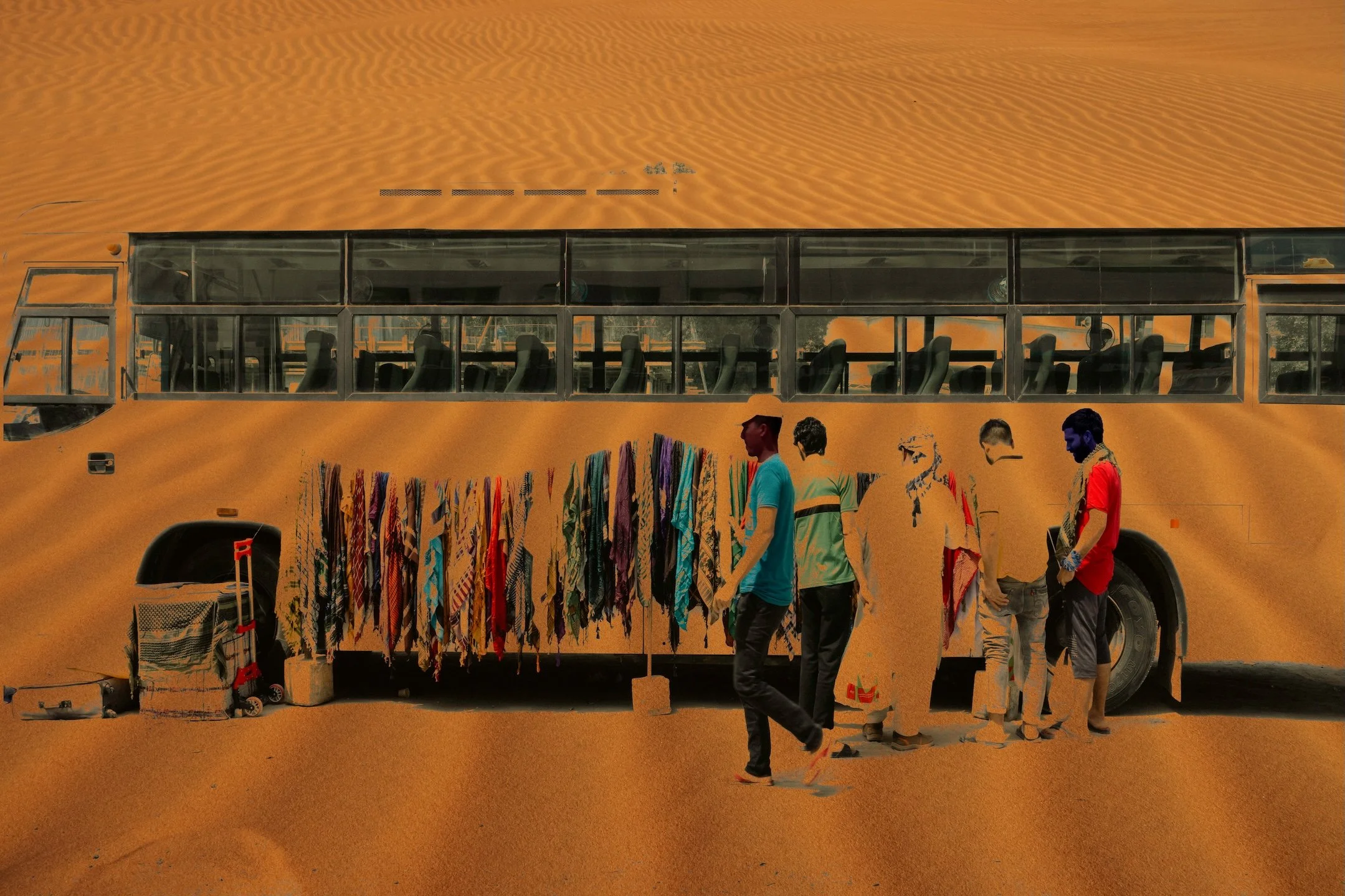 “The day…” is a multimedia project that weaves personal testimonies of South Asian indentured laborers in Dubai, United Arab Emirates, and Doha, Qatar with visual traces of their lived realities. Through collage, drawing, installation, photography, video, audio, and text, it reveals glimpses of hidden neighborhoods, makeshift roadside bazaars, and vernacular landscapes—spaces largely concealed from public view. These are starkly contrasted with the iconic skylines their labor helped construct. Distant glimpses of migrant housing, obscured from the outside world, are juxtaposed with the natural landscape of the region, heightening the tension and disconnect within a layered environment that exposes the contradictions underlying these glamorized urban centers. This immersive setting will be overlaid with personal reflections by those who leave home to labor in foreign lands alongside poetry by authors directly tied to South Asia. The project itself is one of a trio of inter-related works, together with Stories from the Core (Oklahoma, 2022) and Unearthing Stories from the Core (Pakistan, 2023). “The day…” fills a void in the visual arts, centering South Asian migrant workers and positions art as a conduit toward reckoning, reconciliation and healing.