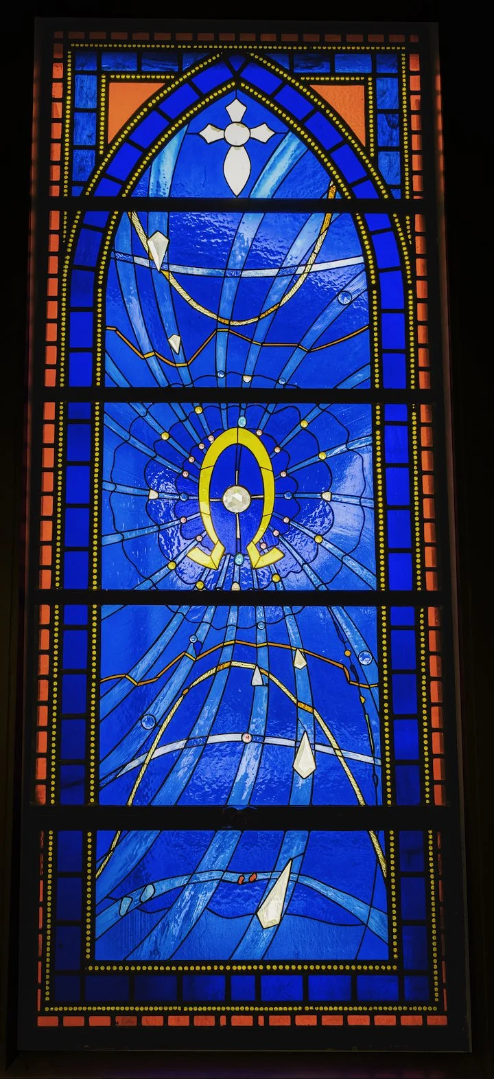 Stained glass window at the United Church at Los Alamos. The Omega sign, the last letter of the Greek alphabet, symbolizes the“Great End.” Embedded in a mushrooming cloud, similar to the images of the first atom bomb created at Los Alamos and tested at Trinity site in New Mexico, the Omega symbol is directly under the Cross at the top, and has a crystal in the middle.