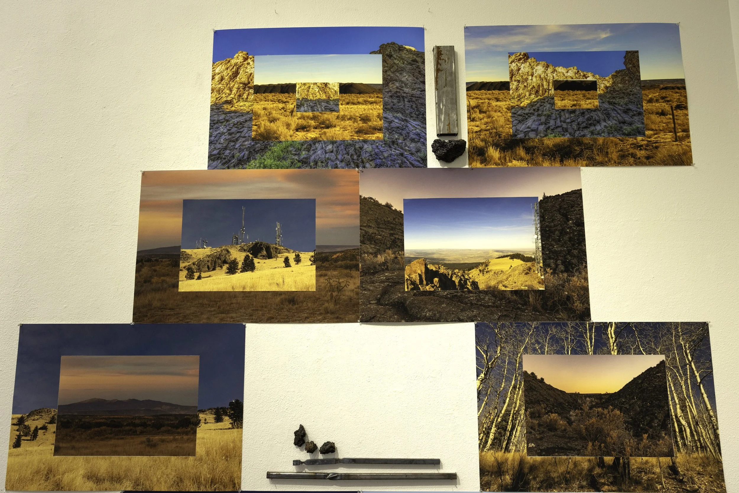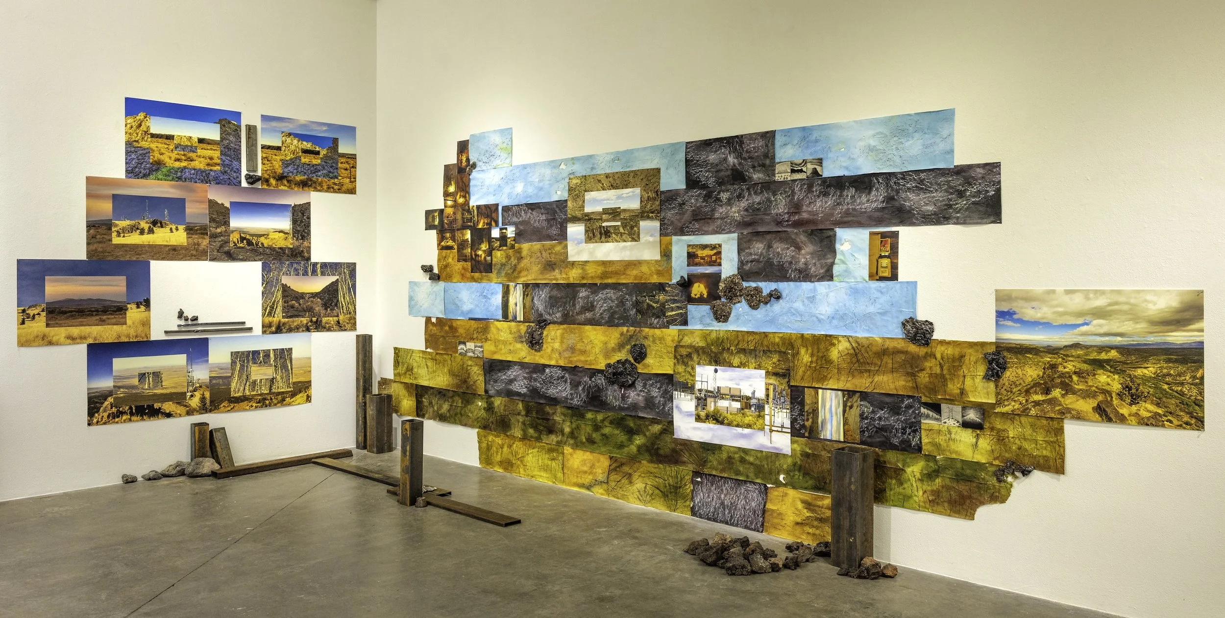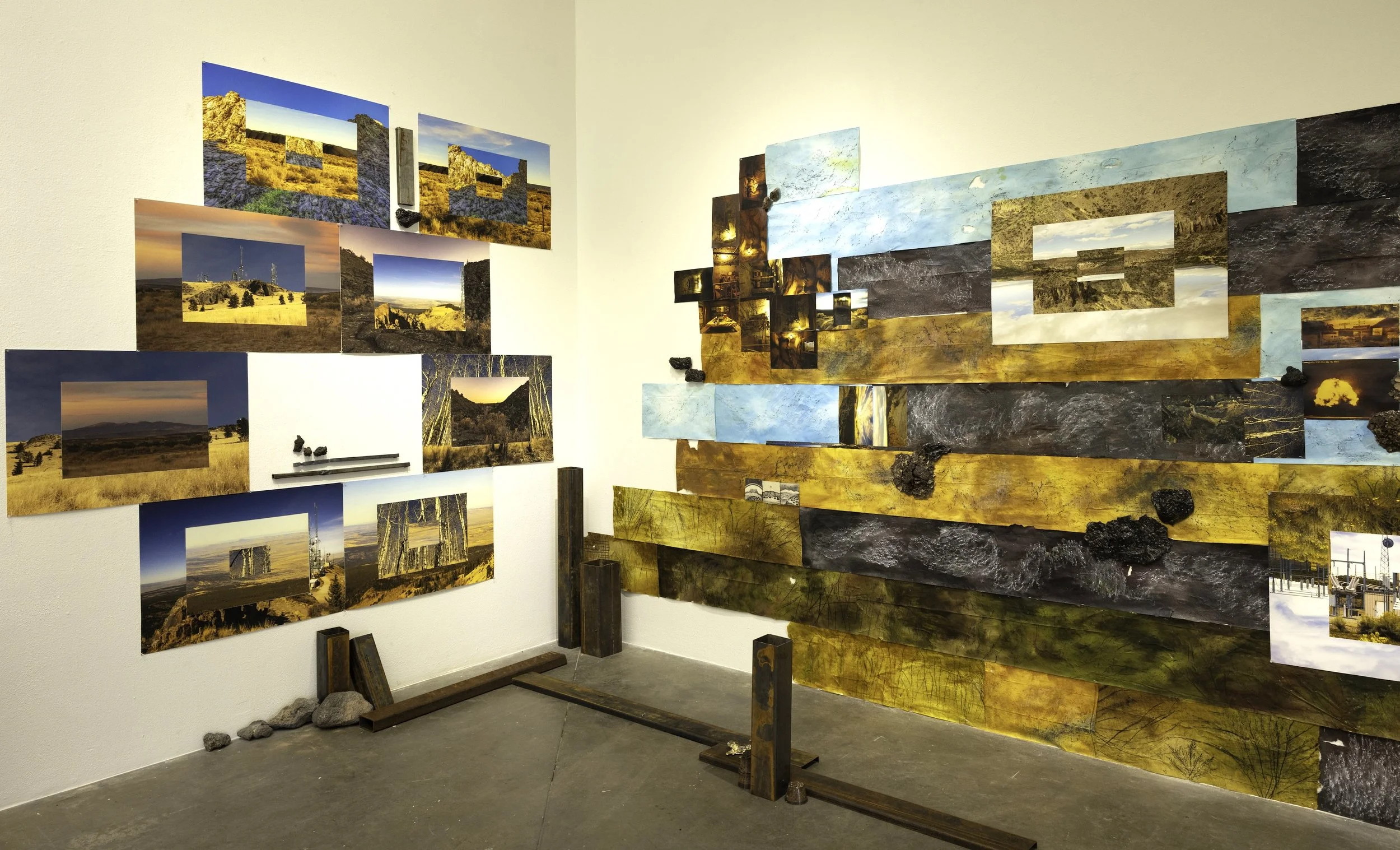 Materials: Photo prints on Estrada paper, rock casting, texture rubbings of volcanic rocks and plants on Kozo paper, volcanic ash, acrylic paint, graphite powder, gouache, resin, clay, rocks, iron beams, charcoal and graphite drawings, silicone.