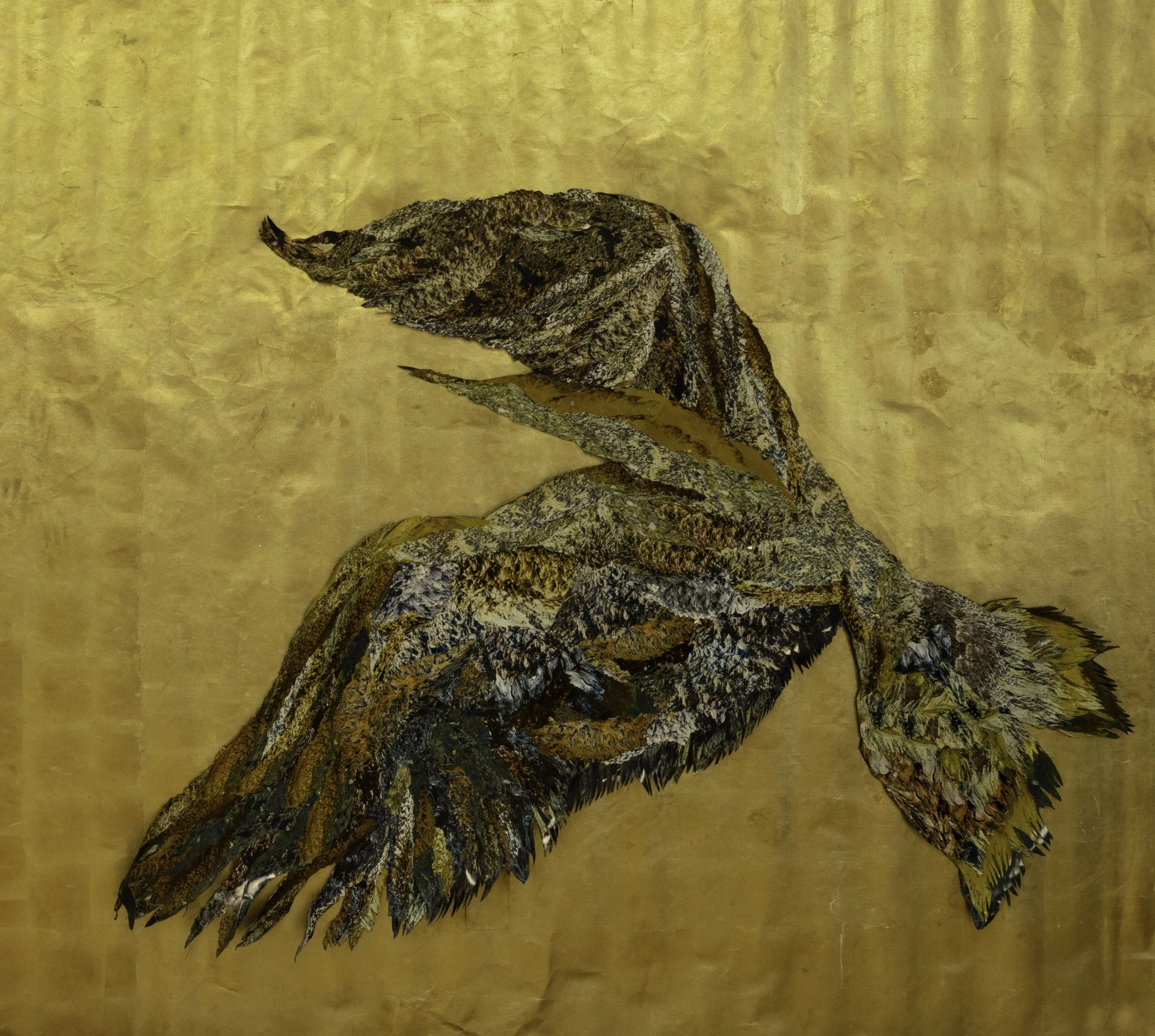 The birds in parwaaz are abstractions: collaged photos of glaciers in Gilgit-Baltistan’s (N. Pakistan) majestic and ecologically endangered landscapes. The landscape transmutes into soaring birds, enshrined in gold. They were created during artist residencies in 2024 as part of my “Alchemy of Disappearance” installations (Unearthing Stories From The Core project). These studio installation played with the idea of 'always becoming.' An ever-evolving sanctuary to the transfiguration from banal to precious, underscored by my extensive use of gold leaf, recalling alchemy.