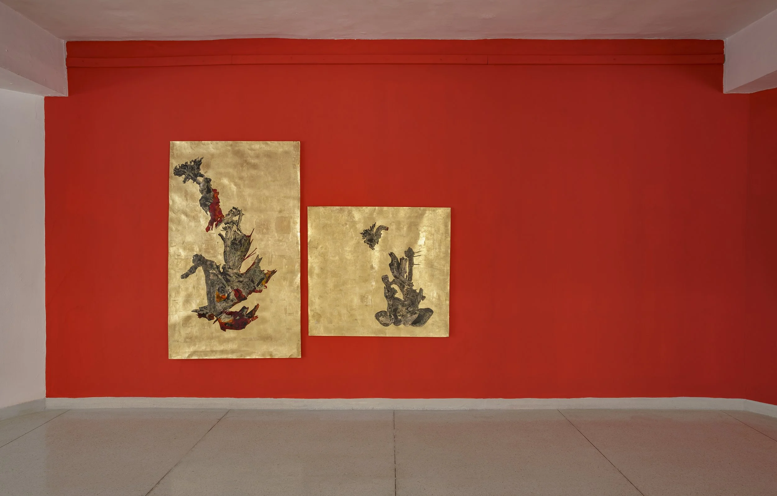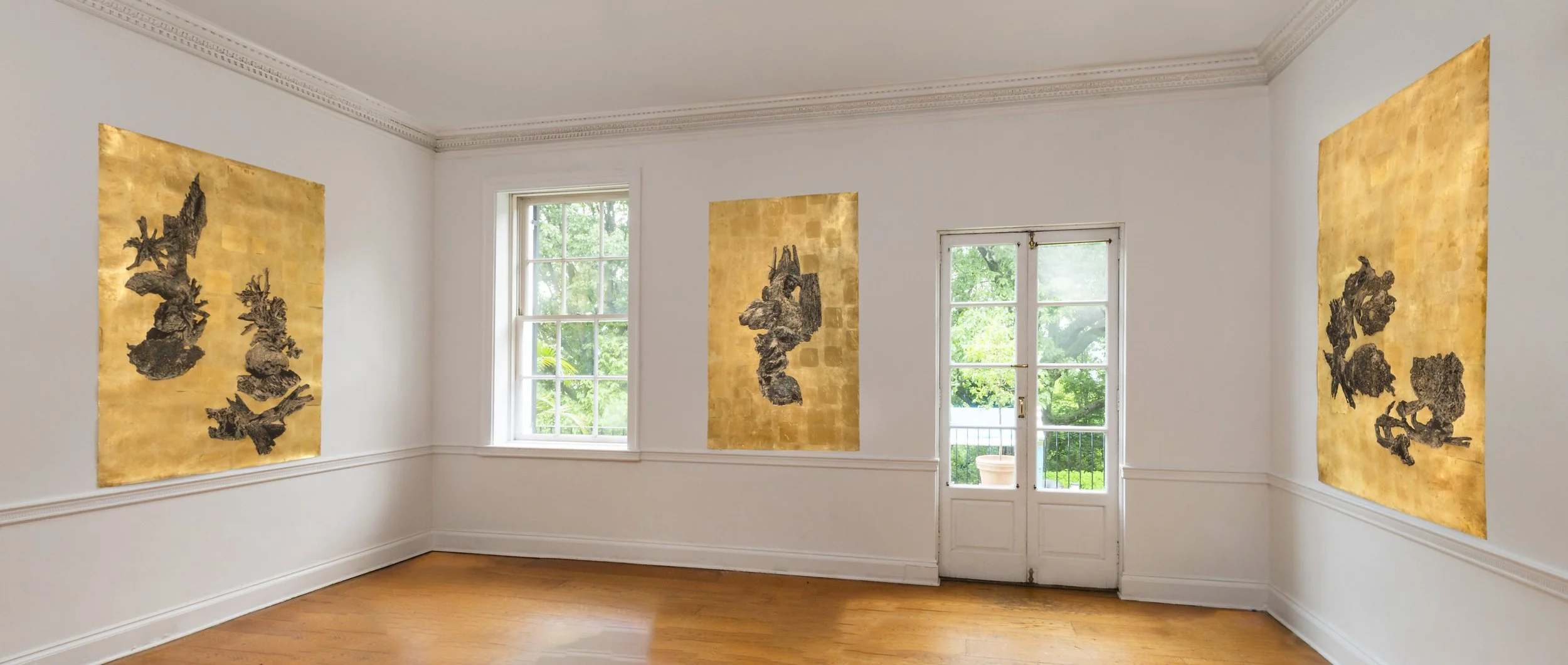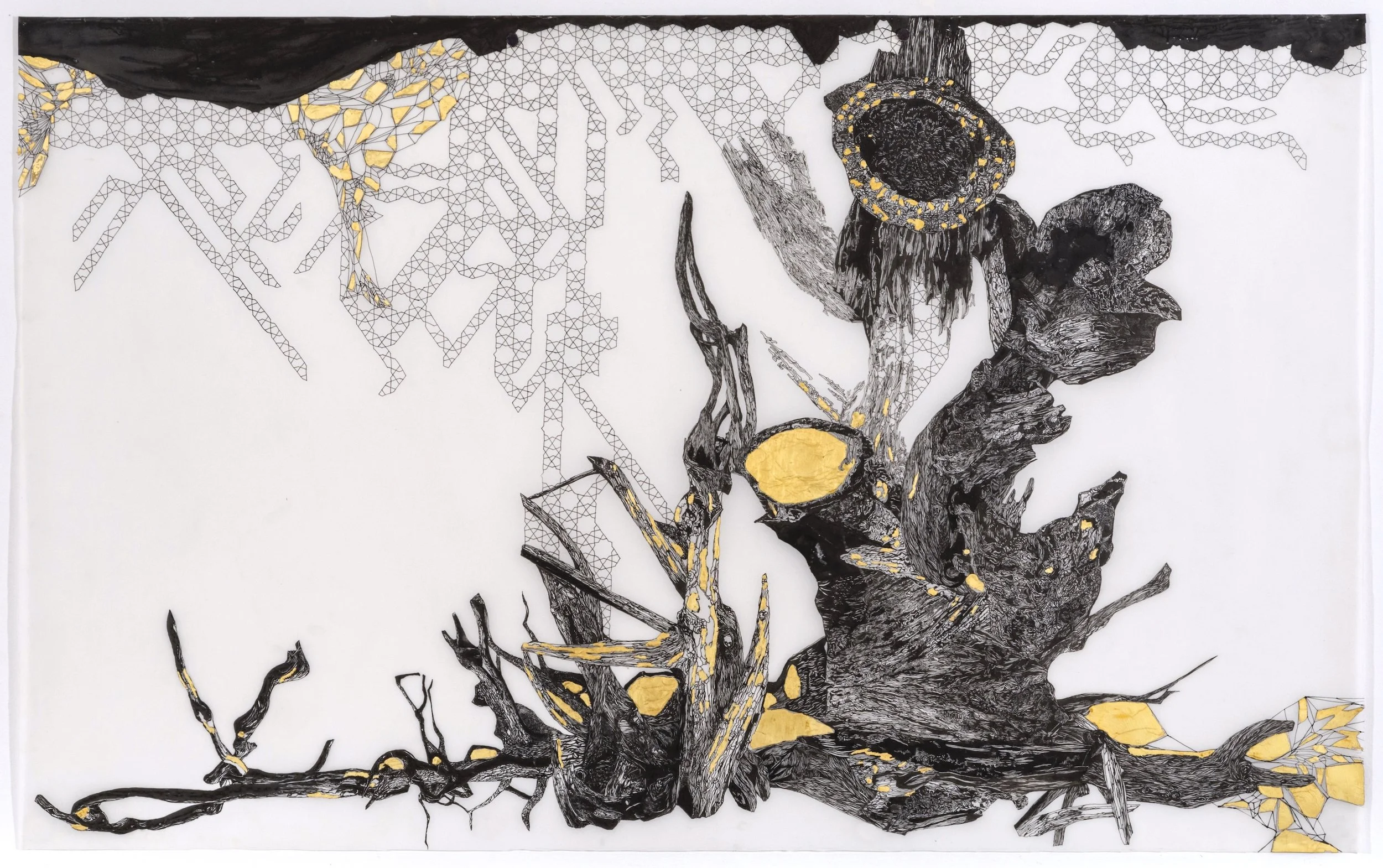 Fractured Alchemy, ink drawings on vellum collaged on gold leaf on Arches watercolor paper, 68 x 48 in. each